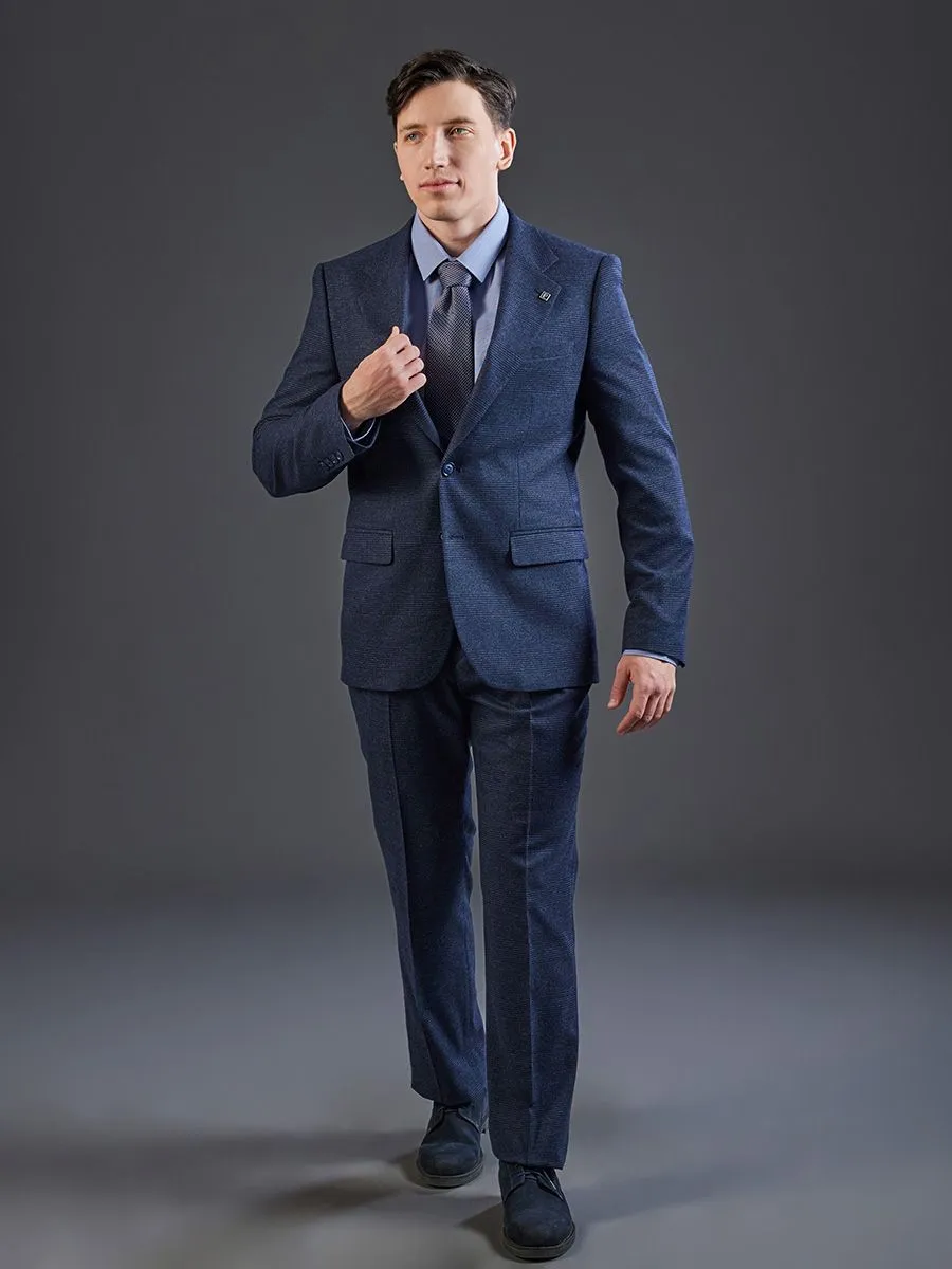 Костюм выполнен в полуприлегающем силуэте темно-синего цвета. Модель отличается широким лацканом и имеет одну шлицу сзади. Брюки прямого кроя оснащены комфортной резинкой на поясе. Ткань представляет собой сдержанную неконтрастную клетку. Этот ансамбль сочетает в себе классические элементы и современный крой. Композиция подходит для создания как формального, так и повседневного образа. Лаконичный дизайн делает костюм универсальным решением для гардероба.