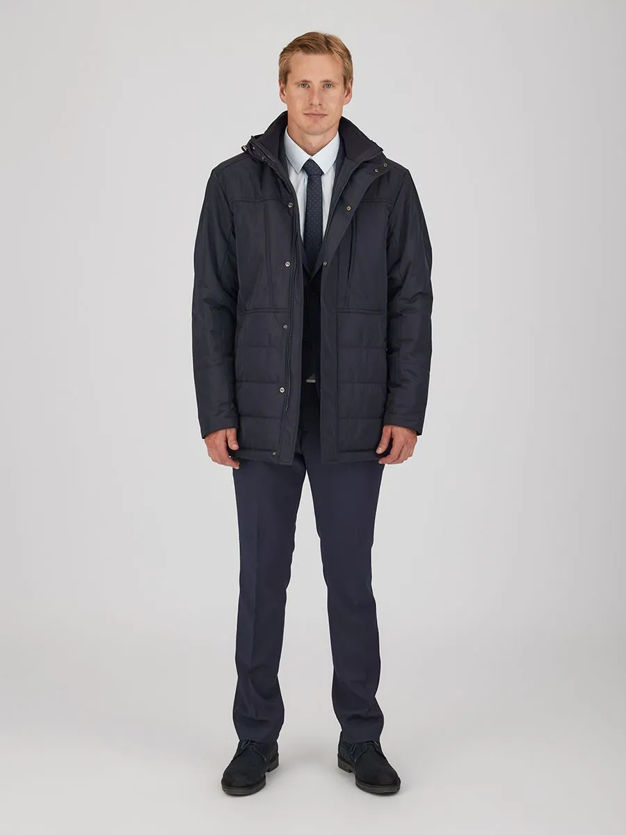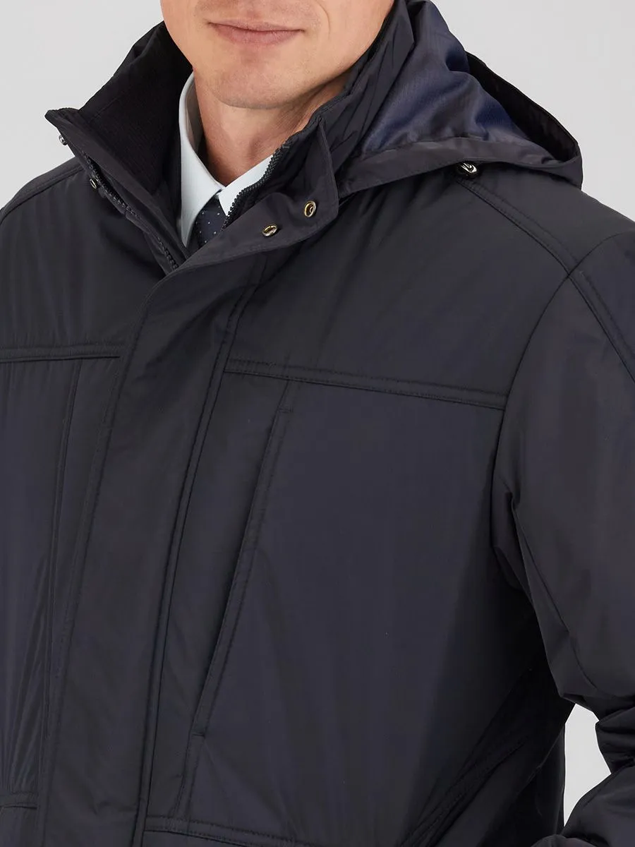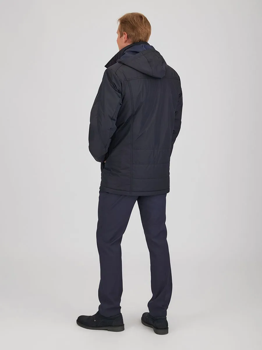 Мужская утепленная куртка удлиненного силуэта – идеальный выбор для тех, кто ценит комфорт и защиту от непогоды. Практичный капюшон, вместительный нагрудный карман и высокий ворот надежно защитят от ветра и холода. Застежка на молнию с дополнительной фиксацией кнопками гарантирует надежность, а регулируемые затяжки на капюшоне и по низу куртки позволяют подогнать посадку под индивидуальные предпочтения.