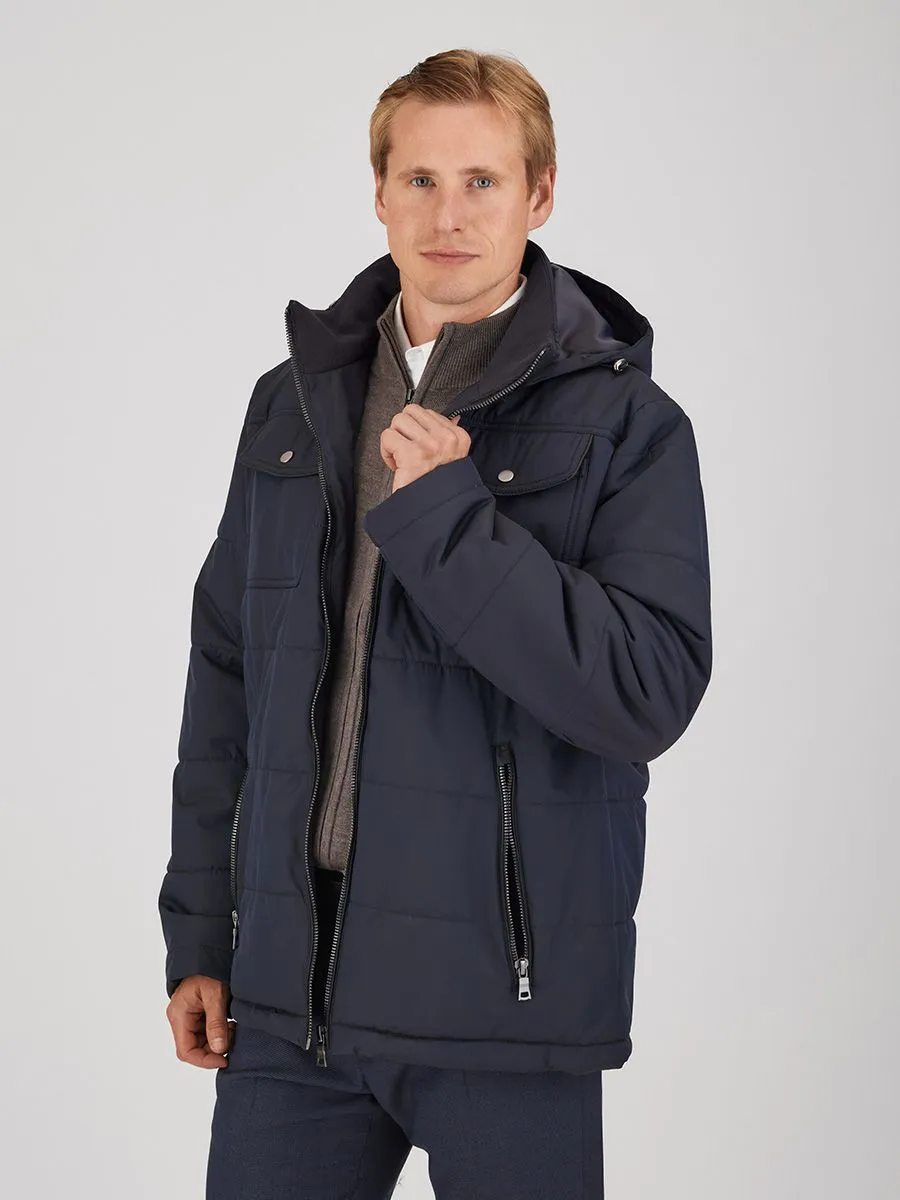 Эта укороченная утепленная куртка тёмно-синего цвета – идеальный выбор для тех, кто ценит комфорт и стиль. Нагрудные карманы с клапанами, застегивающимися на кнопки, обеспечивают удобное и безопасное хранение необходимых мелочей. Застежка-молния позволяет быстро и легко надевать и снимать куртку.Непогода больше не помеха, благодаря удобному капюшону. Затяжки-регуляторы на капюшоне и по низу куртки позволяют индивидуально подогнать посадку, обеспечивая максимальную защиту от ветра и холода. Сочетая в себе практичность и современный дизайн, эта куртка станет незаменимой частью вашего гардероба.