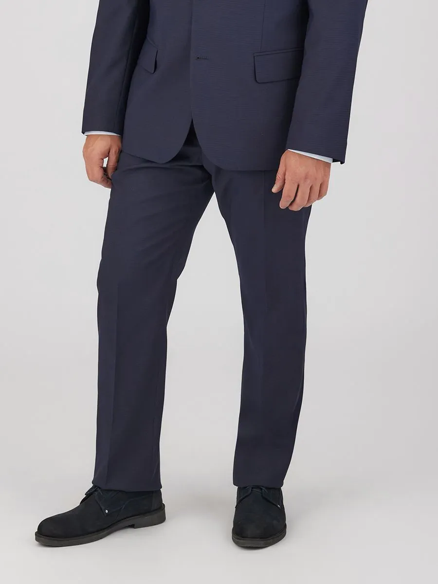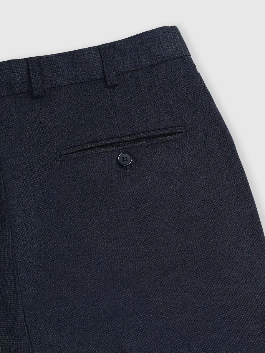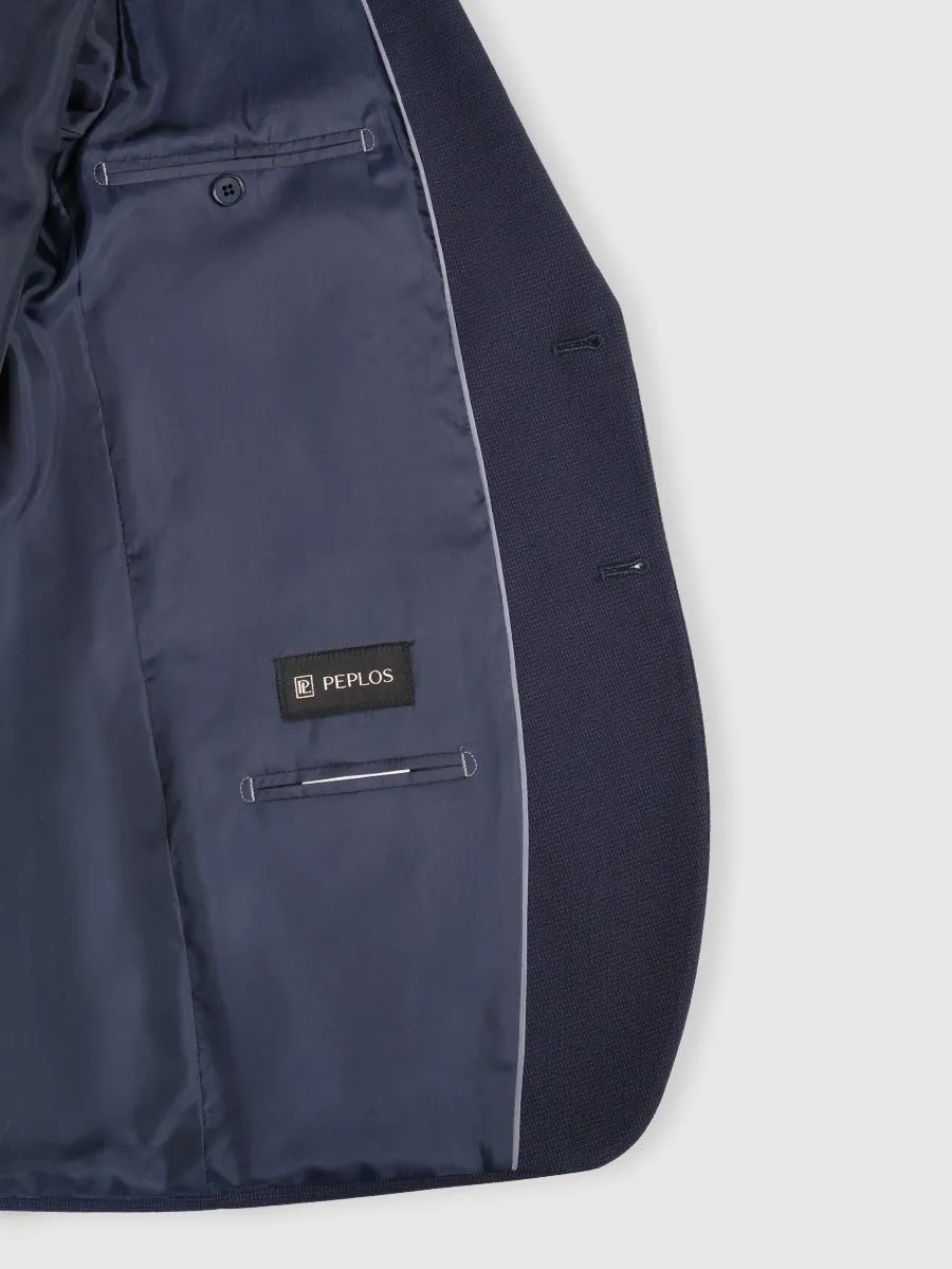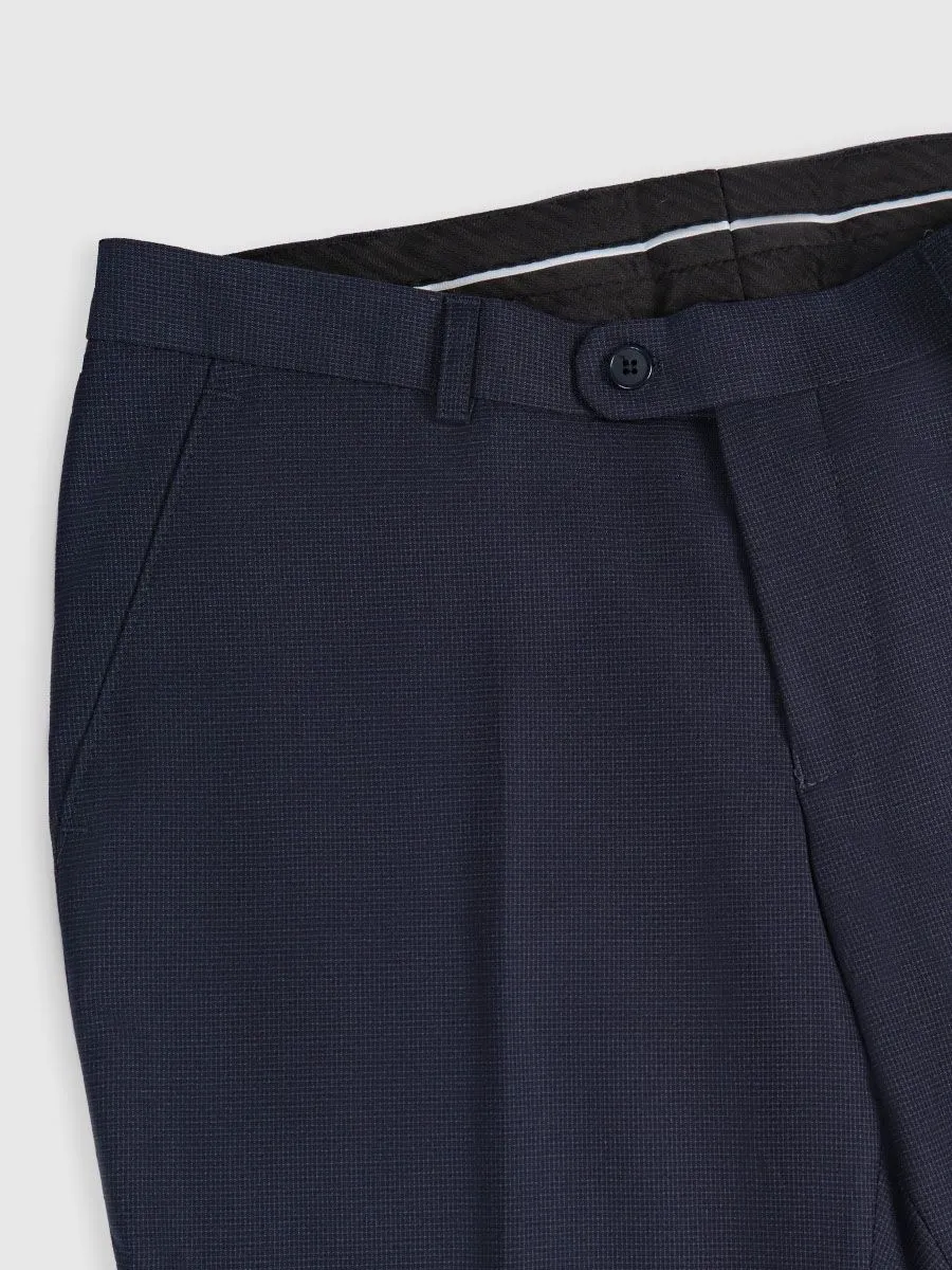 Мужской костюм, воплощающий элегантность и комфорт, выполнен в полуприлегающем силуэте из темно-синей ткани с микродизайном. Классический пиджак полуприлегающего силуэта отличается широким прямым лацканом (9 см) и двумя шлицами, обеспечивая свободу движений. Завершают образ мужские классические брюки со стрелками, высокой посадкой талии и легким заужением книзу, дополненные подкладкой, корсажной лентой на поясе и тесьмой по низу.