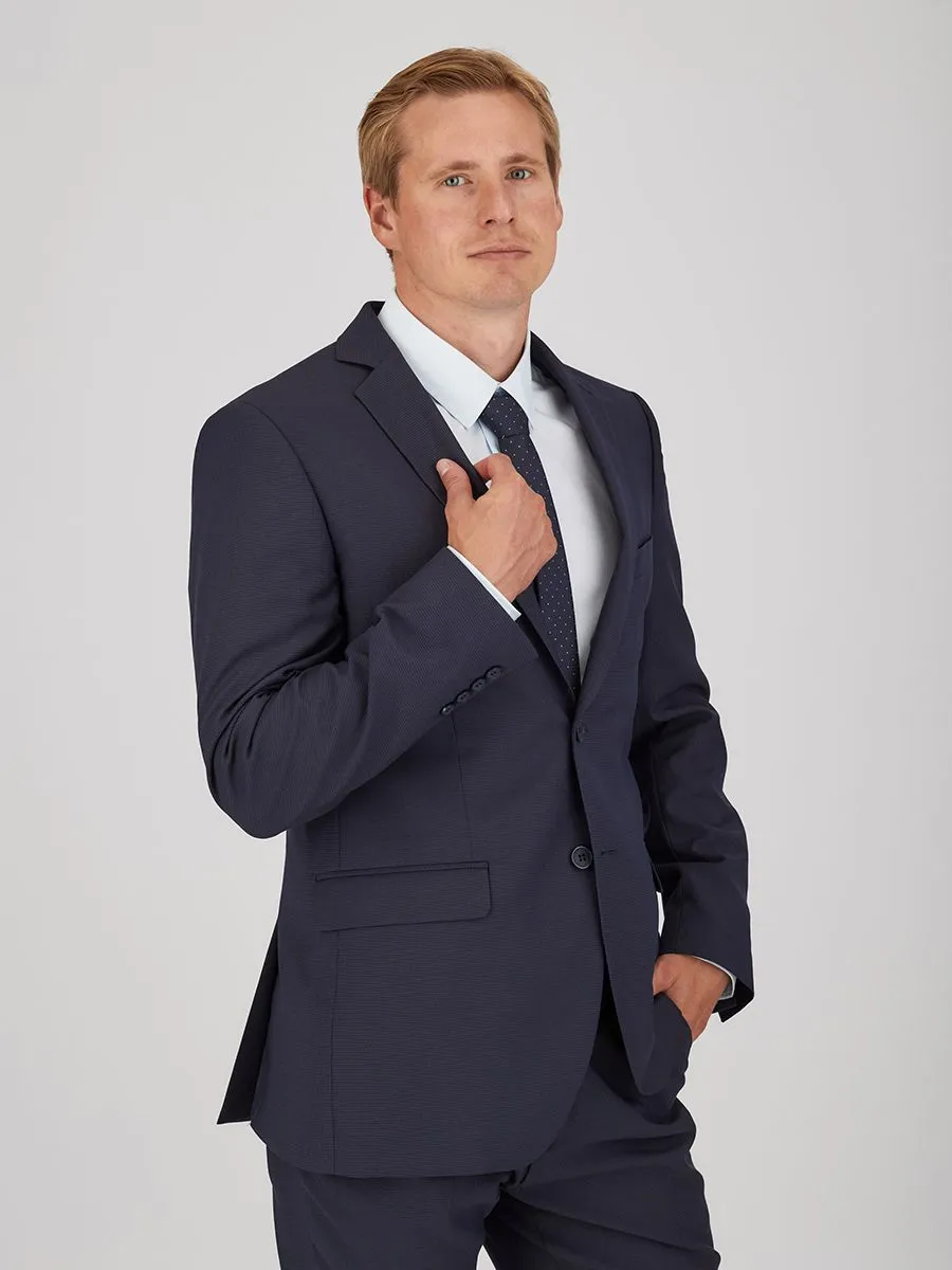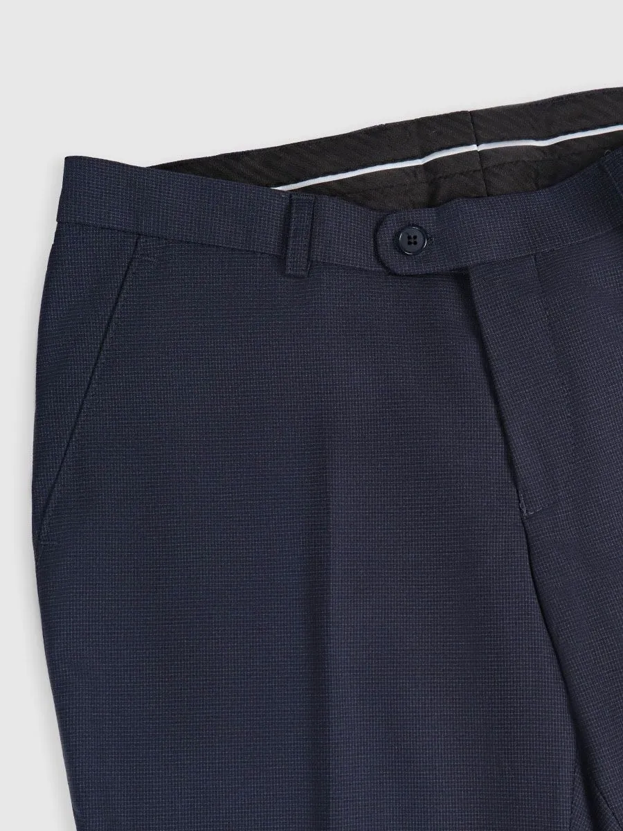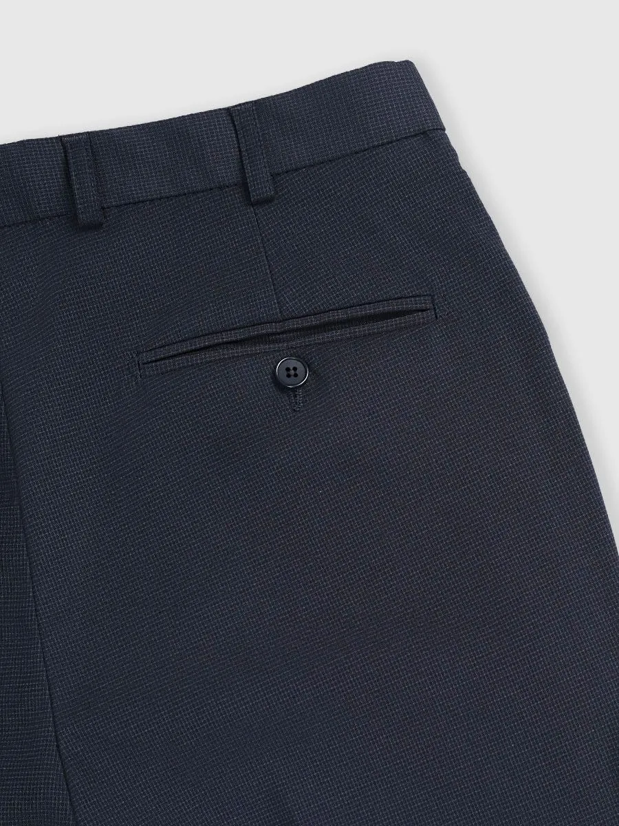 Мужской костюм, выполненный в глубоком темно-синем цвете, привлекает внимание микродизайном на ткани в виде мелкой контрастной клетки, добавляющей образу изысканности и глубины. Классический пиджак приталенного силуэта, с увеличенной длиной изделия, подчеркивает достоинства фигуры, а традиционное плечо придает образу элегантность. Брюки с более высокой посадкой, со стрелками, на подкладе и с поясом на корсажной ленте, обеспечивают комфорт и безупречный внешний вид.