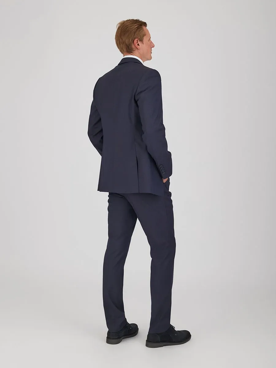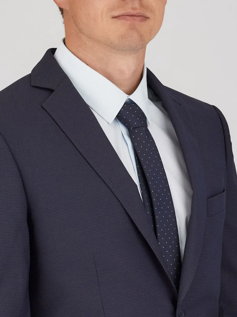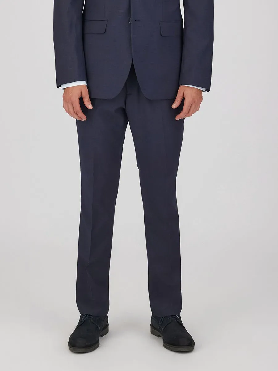 Мужской костюм, выполненный в глубоком темно-синем цвете, привлекает внимание микродизайном на ткани в виде мелкой контрастной клетки, добавляющей образу изысканности и глубины. Классический пиджак приталенного силуэта, с увеличенной длиной изделия, подчеркивает достоинства фигуры, а традиционное плечо придает образу элегантность. Брюки с более высокой посадкой, со стрелками, на подкладе и с поясом на корсажной ленте, обеспечивают комфорт и безупречный внешний вид.