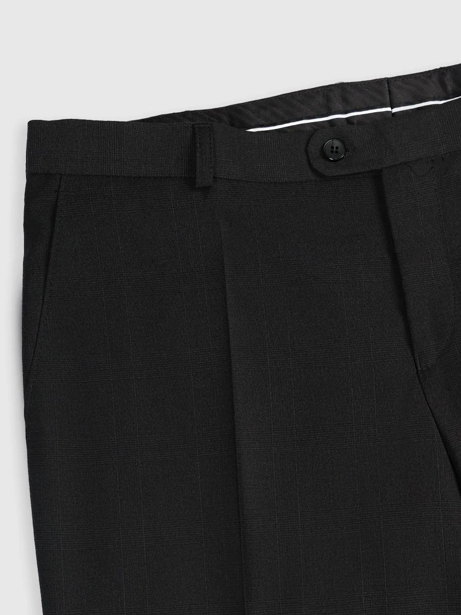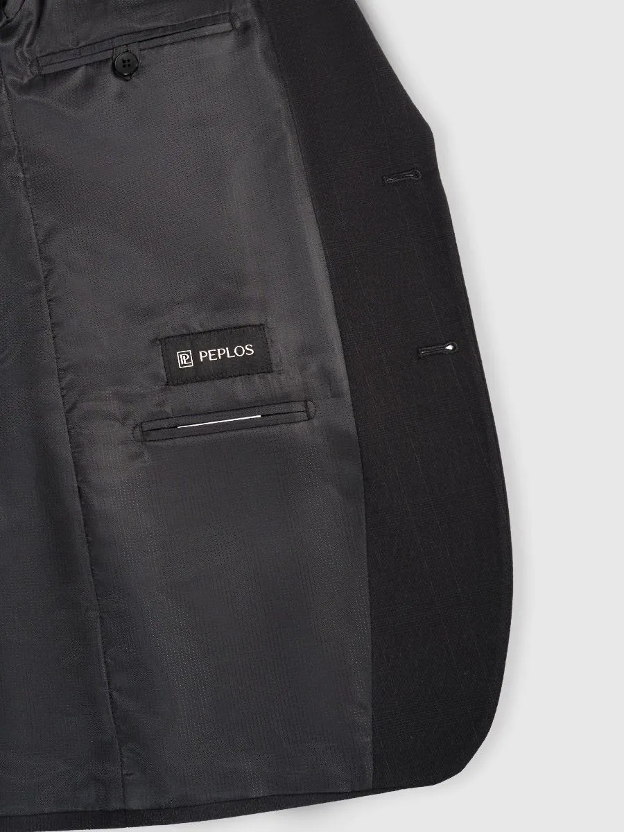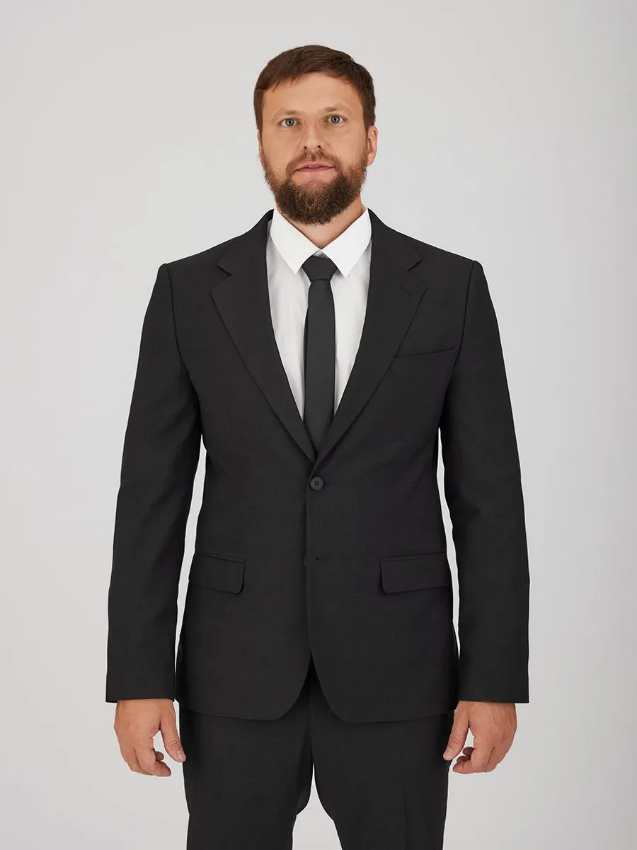 Мужской костюм, выполненный в глубоком черном цвете, представляет собой образец элегантности, слегка смягченной неброским клетчатым рисунком. Полуприлегающий силуэт пиджака деликатно подчеркивает фигуру, а классическое плечо и широкий лацкан добавляют образу уверенность и строгость. Две шлицы обеспечивают комфорт движения, не нарушая четкость линий. Классические брюки со стрелками, отличающиеся высокой посадкой талии (по задней слонке) и легким сужением книзу, завершают ансамбль, создавая гармоничный и стильный образ для деловых встреч и особых случаев.
