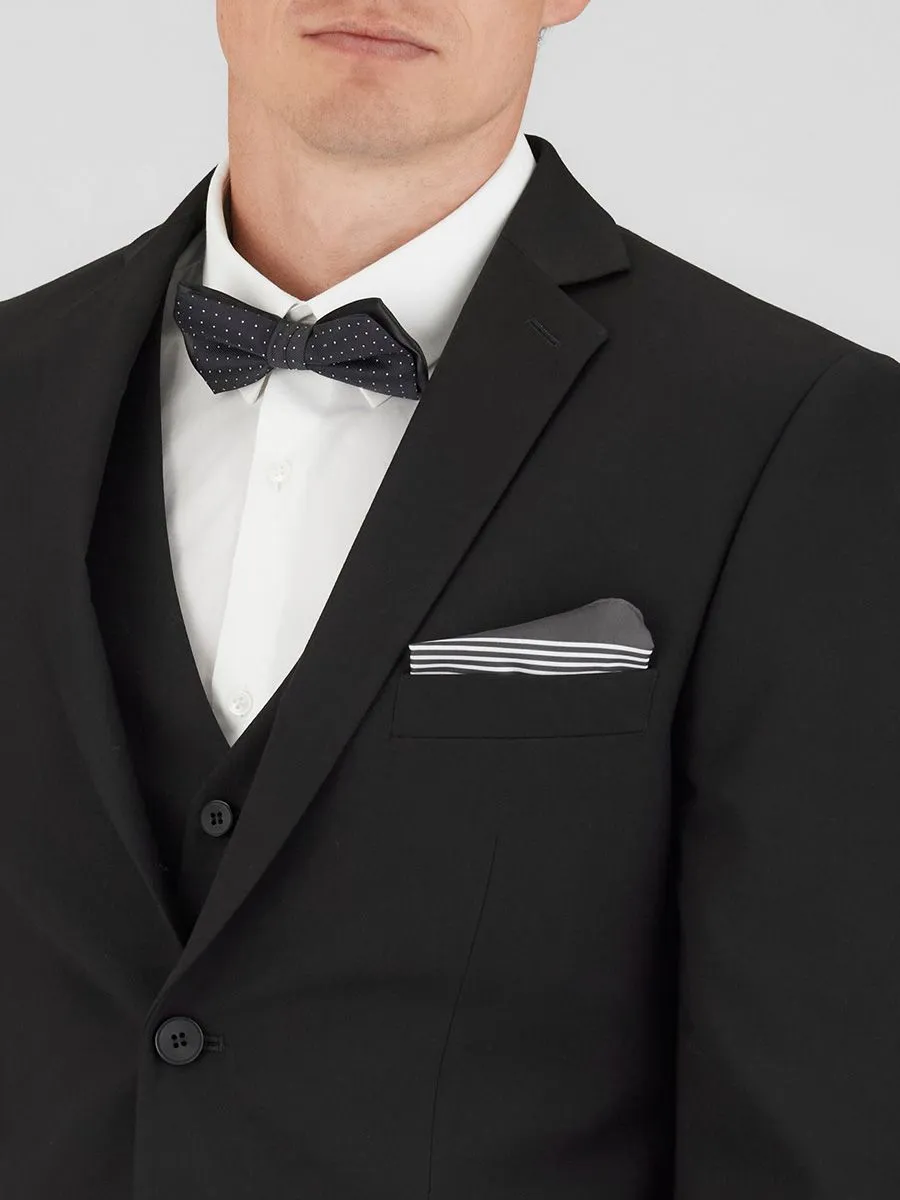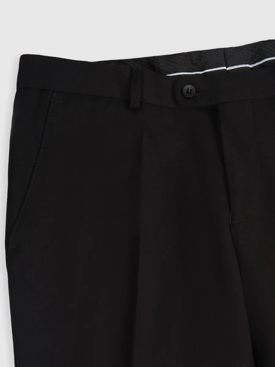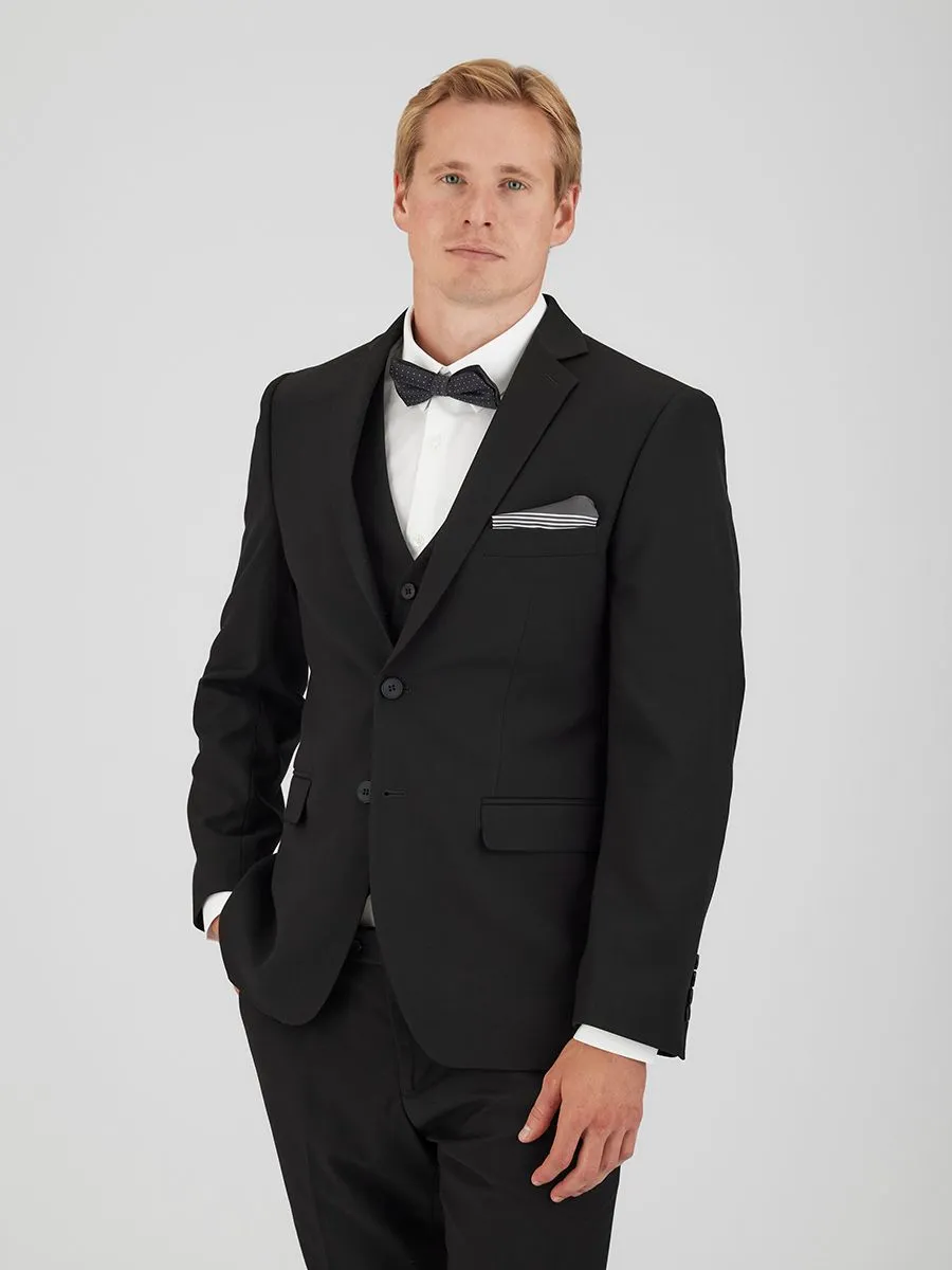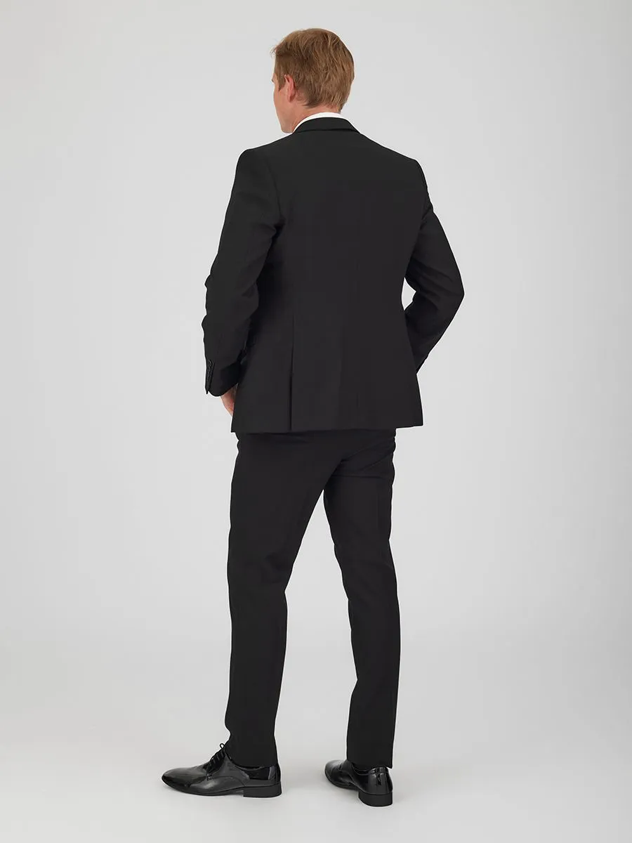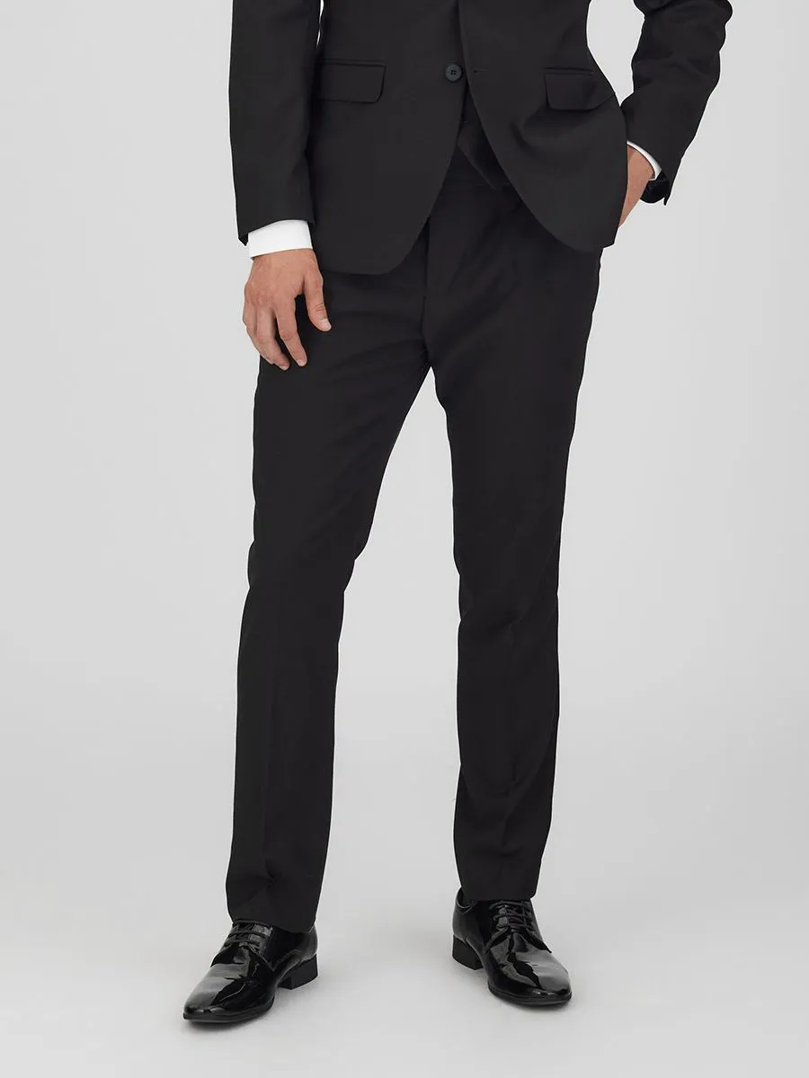 Мужской черный однотонный костюм – воплощение безупречного стиля и элегантности. Модель пиджака приталенная и удлиненная, что создает вытянутый, современный силуэт, подчеркивая достоинства фигуры. Облегченное плечо обеспечивает комфорт и свободу движений, в то время как нагрудный карман-листочка придает образу изысканный штрих и дает возможность придать образу торжественности с помощью нагрудного платка. Две шлицы сзади и боковые карманы в рамку с клапаном демонстрируют внимание к деталям. Зауженные книзу брюки со стрелками, выполненные на подкладе и с поясом на корсажной ленте, завершают образ, создавая цельный и гармоничный ансамбль для уверенного в себе мужчины.