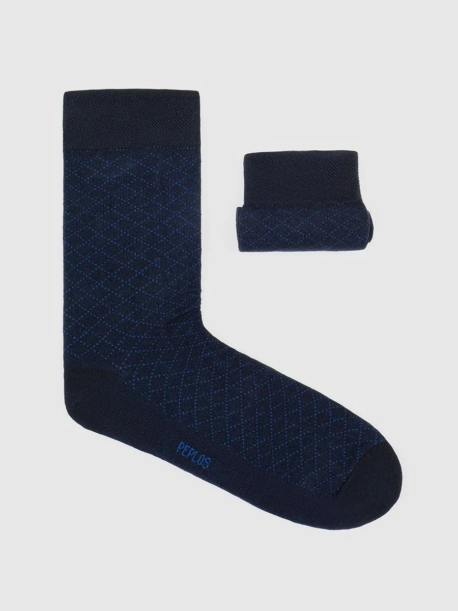 Темно-синие носки с контрастным узором в виде ромба. Тактильно приятные, выполнены из качественного хлопка с добавлением полиамида 12%. Носки с рисунком можно носить в сочетании с модными джинсами или casual брюками.