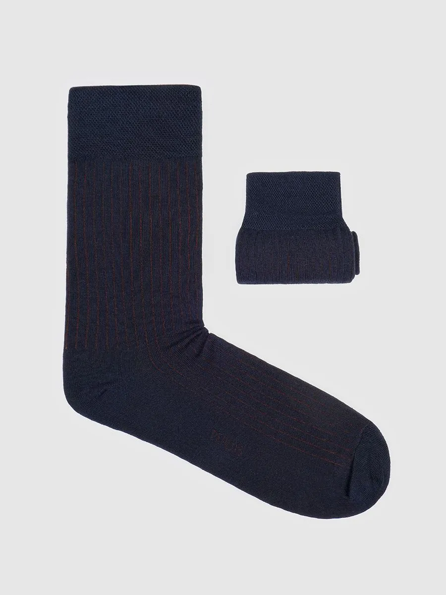 Отличные однотонные носки темно-синего цвета с мелкой контрастной полоской. Хорошо тянутся и приятно облегают ногу.
