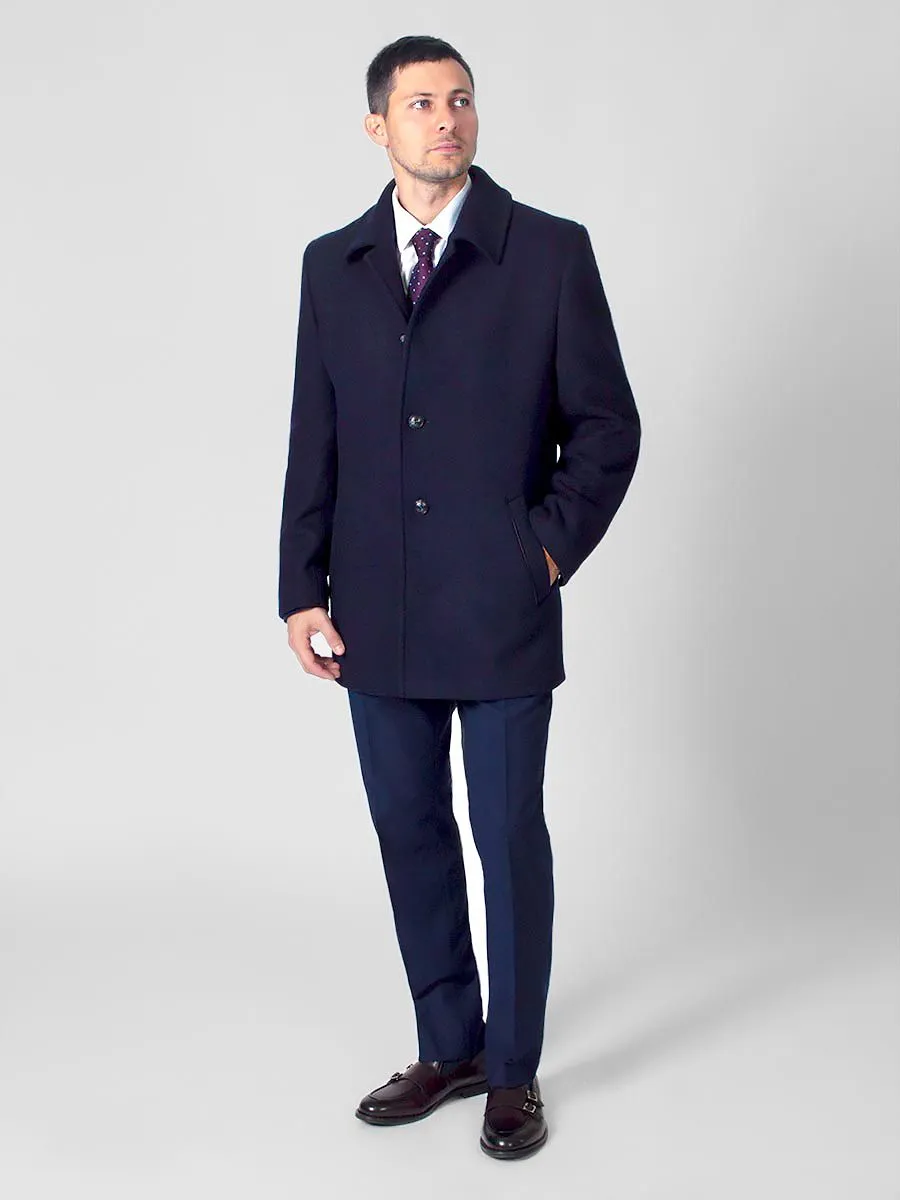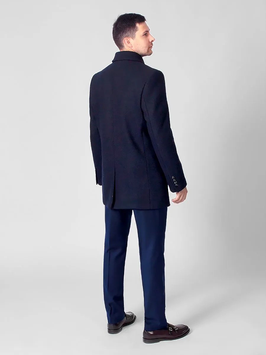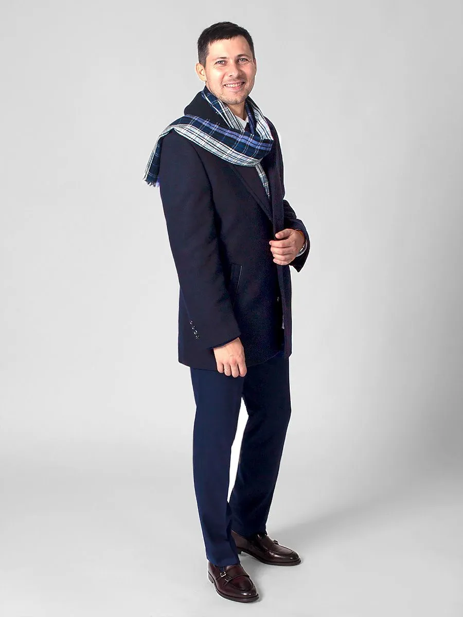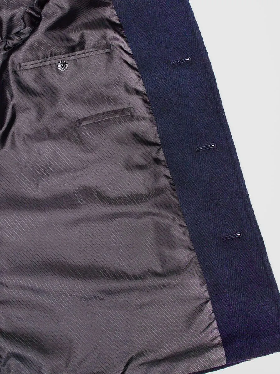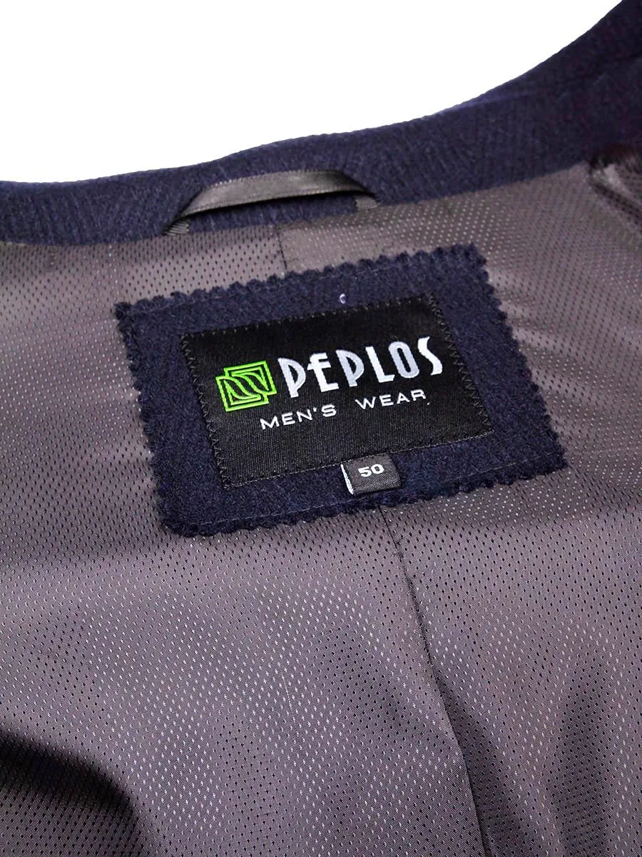 Темно-синее мужское пальто Peplos с крупной фактурной ёлочкой станет дополнением к любому классическому стилю в осенне-зимнее время. Оно идеально подходит для деловых мужчин, любящих строгий дресс-код. Модель с отложным воротником и застежкой на четыре пуговицы. Удобные наклонные карманы с листочками украшены кожаными кантиками. Спинка со средним швом и шлицей. Рукава двухшовные с четырьмя пуговицами. Подклад темного оттенка из пористой ткани сделан из 100% полиэстера. В составе верха содержится 45% шерсти и 55% полиэстера. Пальто хорошо гармонирует с синими костюмами и галстуком черничного цвета.