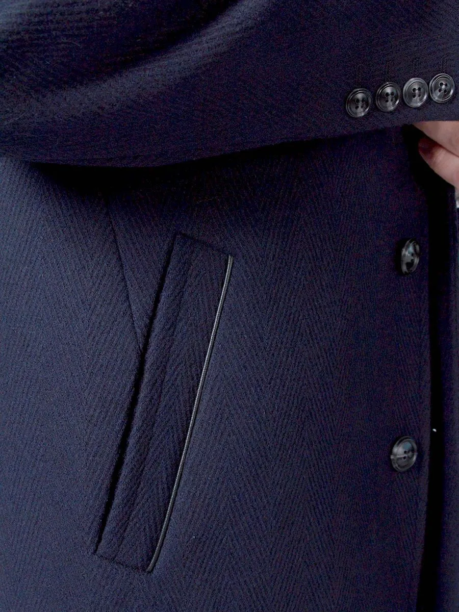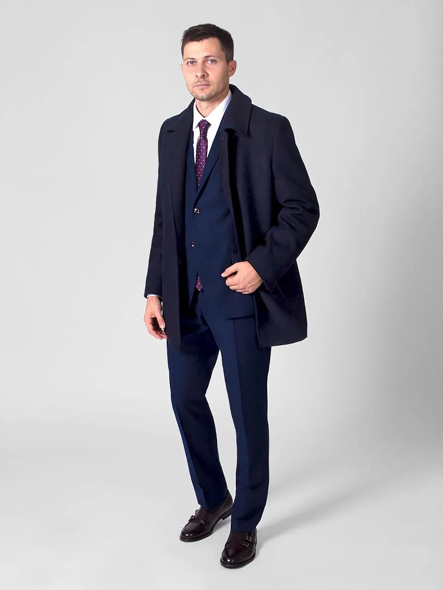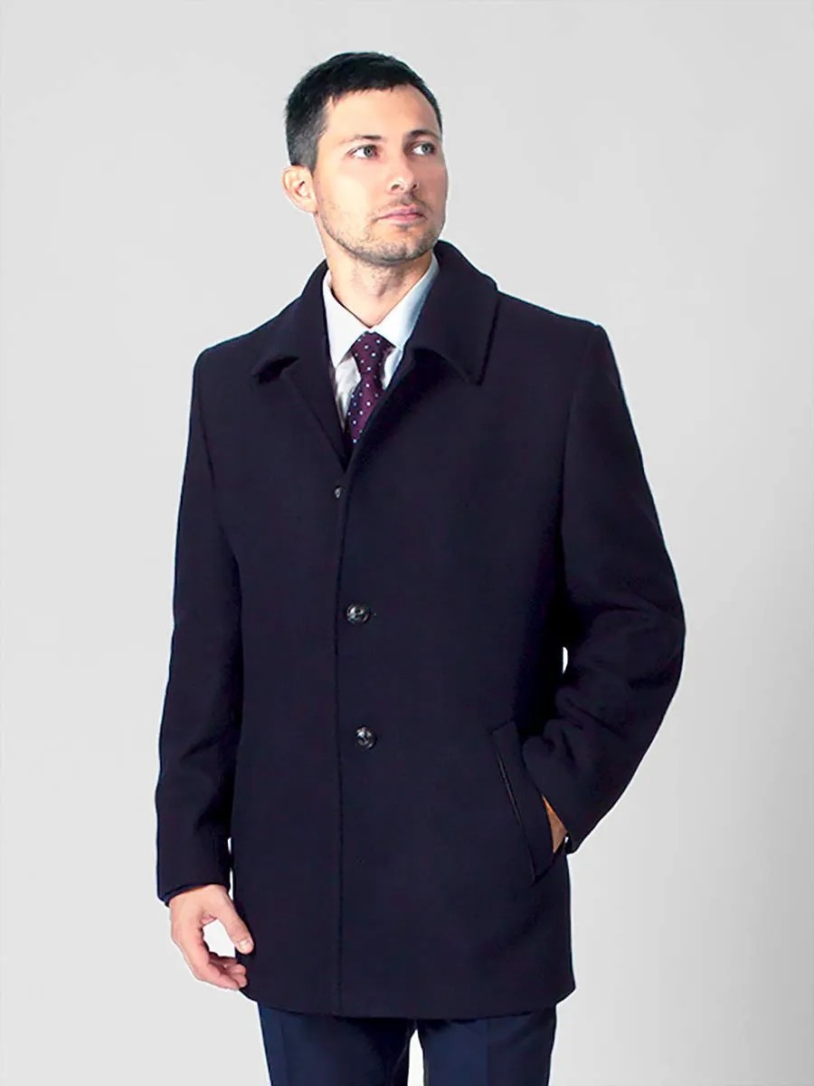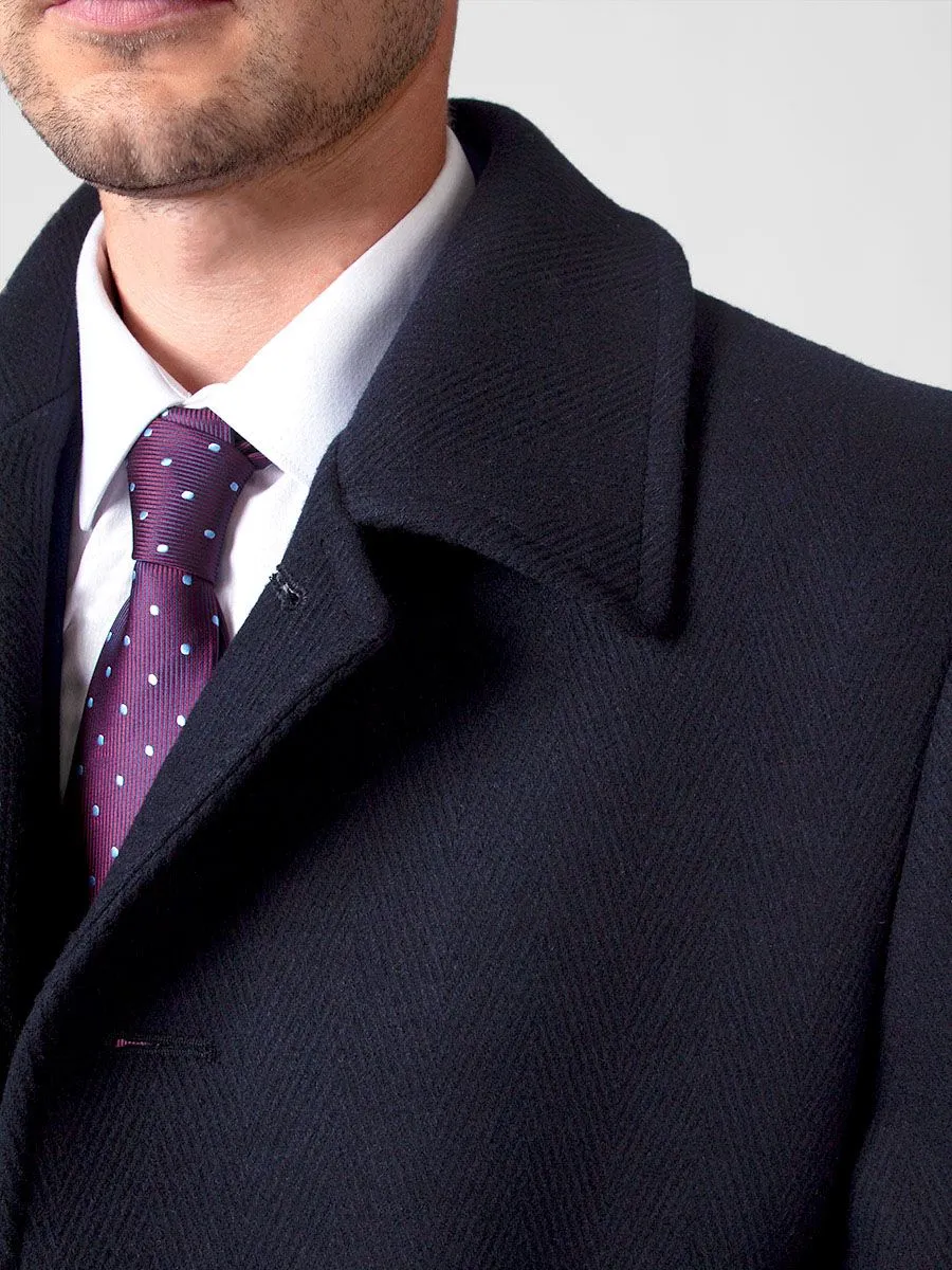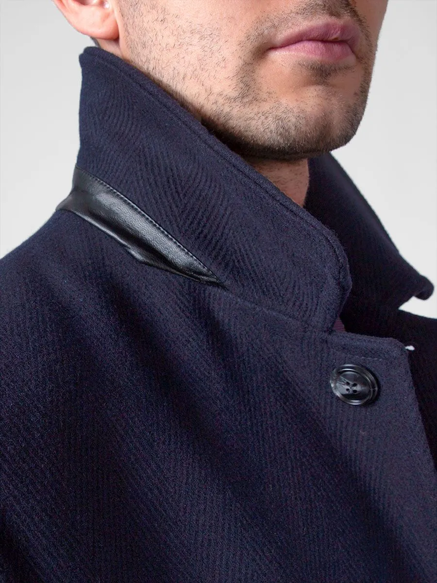Темно-синее мужское пальто Peplos с крупной фактурной ёлочкой станет дополнением к любому классическому стилю в осенне-зимнее время. Оно идеально подходит для деловых мужчин, любящих строгий дресс-код. Модель с отложным воротником и застежкой на четыре пуговицы. Удобные наклонные карманы с листочками украшены кожаными кантиками. Спинка со средним швом и шлицей. Рукава двухшовные с четырьмя пуговицами. Подклад темного оттенка из пористой ткани сделан из 100% полиэстера. В составе верха содержится 45% шерсти и 55% полиэстера. Пальто хорошо гармонирует с синими костюмами и галстуком черничного цвета.