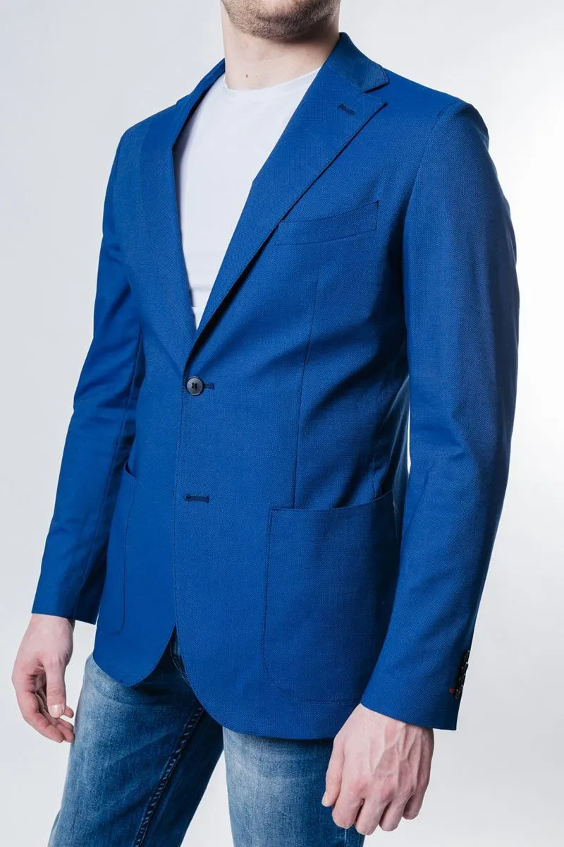 Пиджак CJ1802 полуприлегающего силуэта модели П-836А без плечевых накладок. Модель с накладными карманами - идеальный вариант для повседневного образа. Переплетение синих и голубых нитей ткани создают эффект денима, поэтому рекомендуем носить его с любимым предметом гардероба мужчин - джинсами. Внимание окружающих привлекут к себе детали в красном цвете - петля на рукаве, фильц, кант подборта и отделка внутренних карманов.Ткань их хлопка позволит чувствовать себя комфортно даже в жаркий летний день, а 3% спандекса добавят комфорта движениям. Подклад из вискозы обеспечит хорошую воздухопроницаемость.