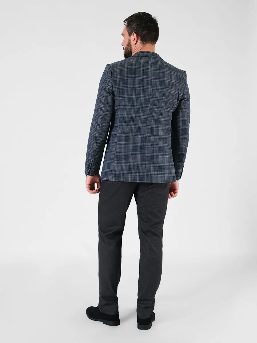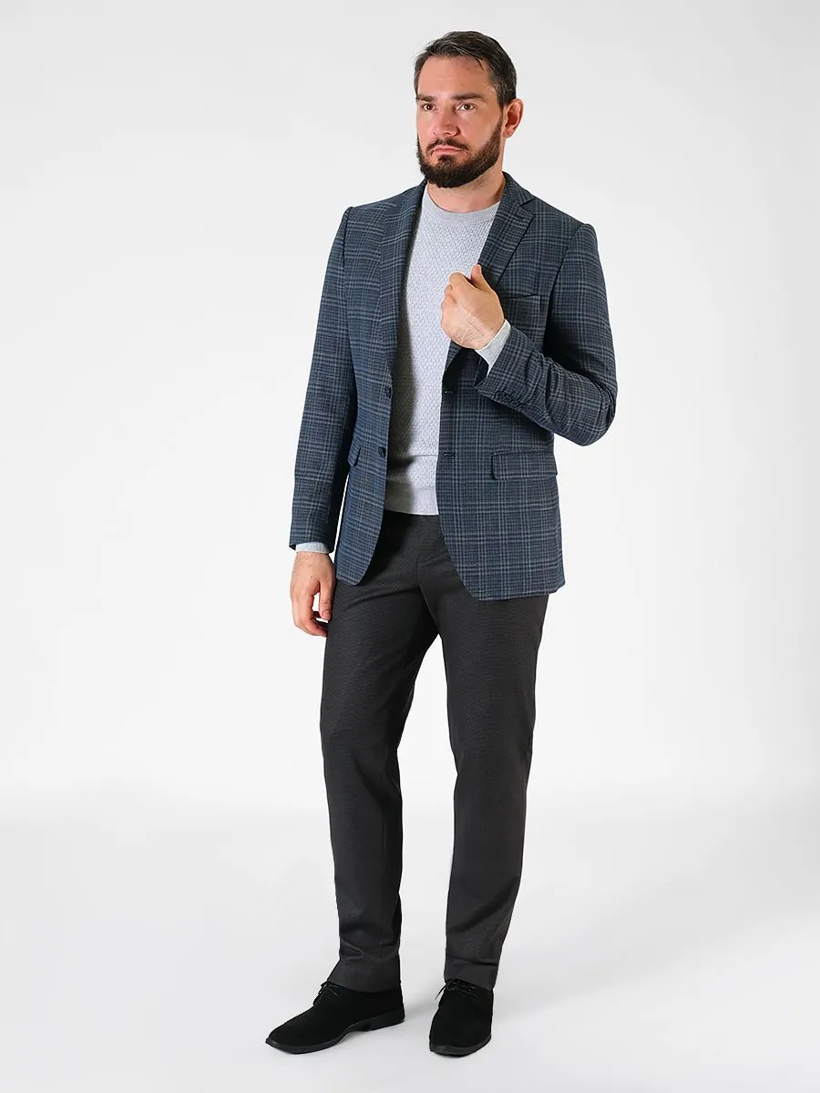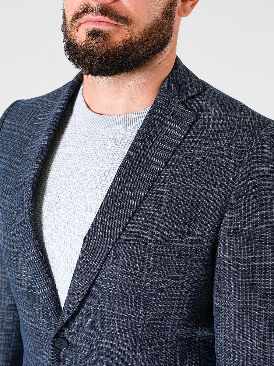 Пиджак выполнен в проверенной и популярной модели в приталенном силуэте. В данной модели предусмотрена застежка на две пуговицы, два кармана с клапанами, два внутренних кармана и две шлицы по спине. Ткань пиджака имеет сложный рисунок в виде клетки, но помимо основной крупной клетки, внутри нее также идет пересечение нитей разного цвета. Поэтому клетка не слишком выделяется, а цвет получается глубоким серо-синим. Полуприлегающий силуэт: JA23112-R
