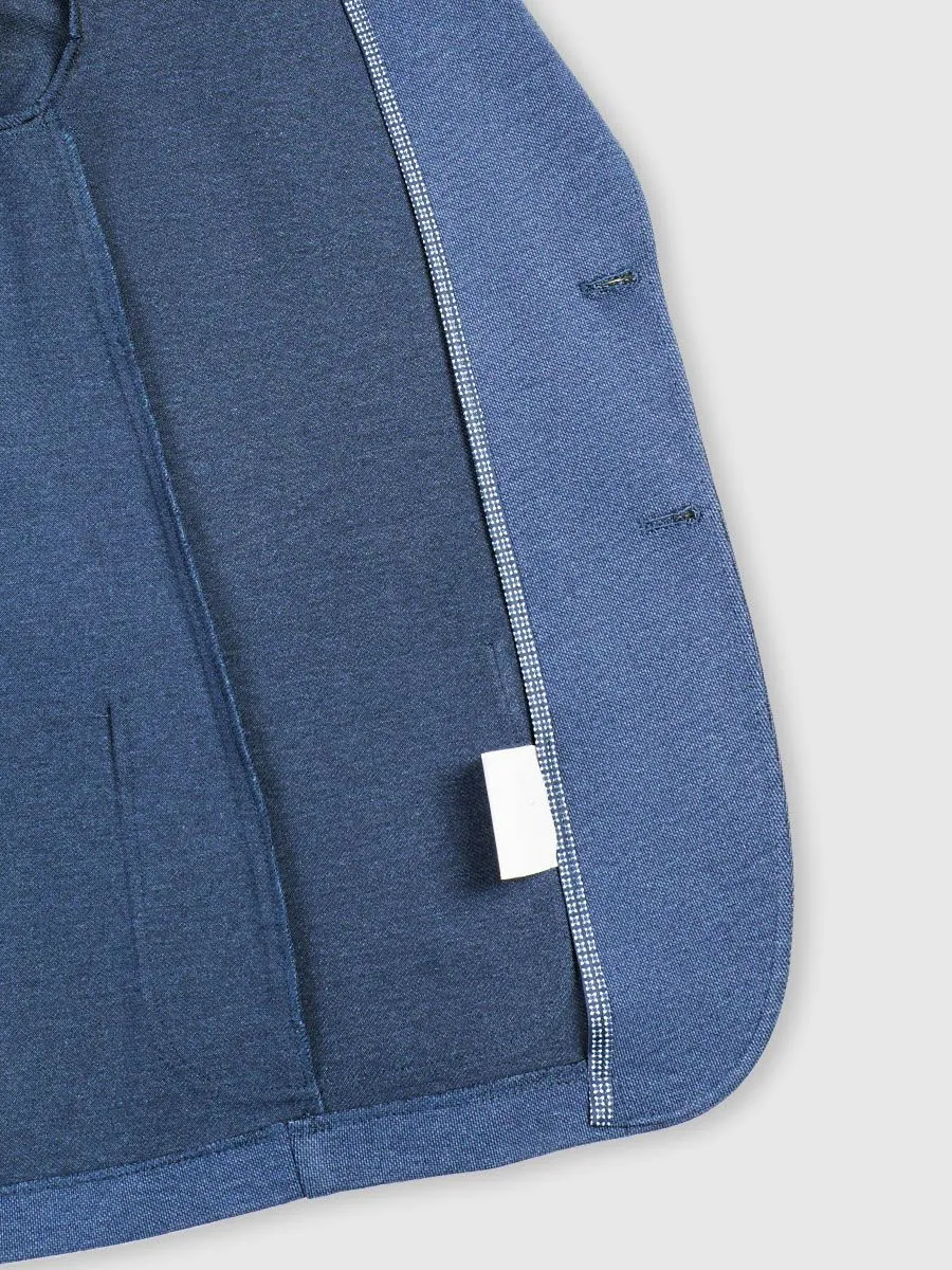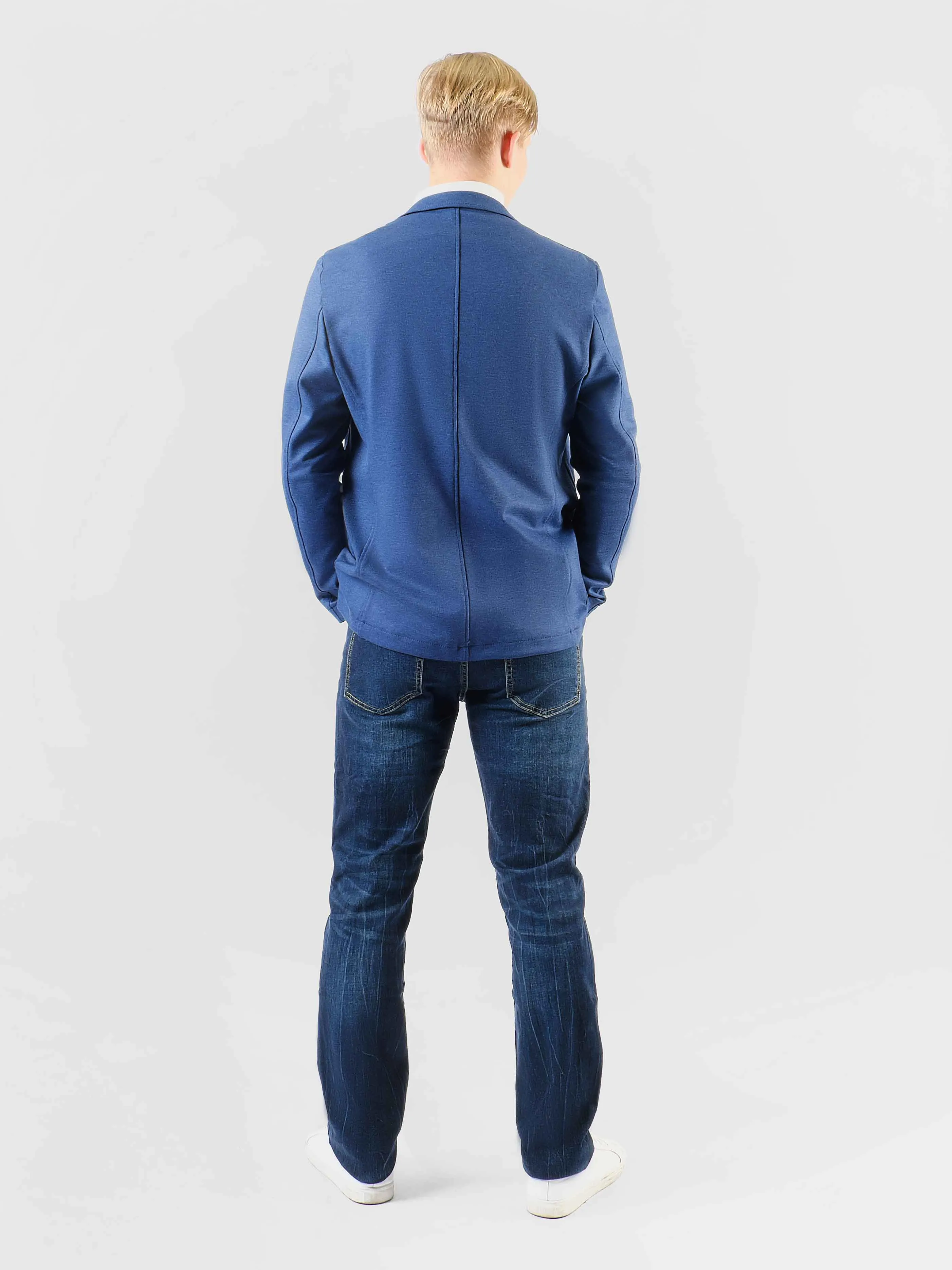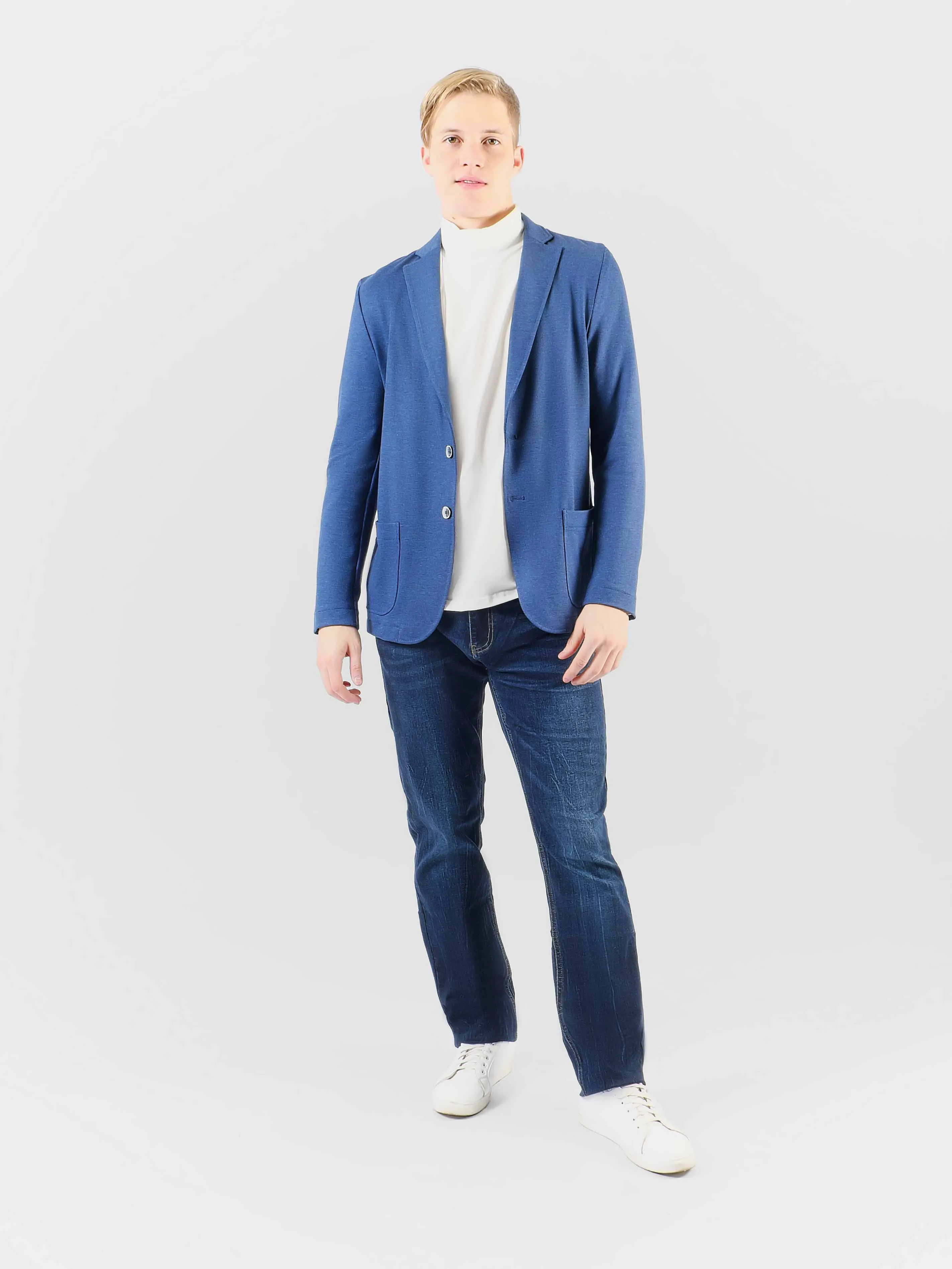 Пиджак мужской трикотажный синий. Трикотажная ткань обеспечивает непревзойденную эластичность и удобство, что делает этот пиджак отличным выбором для активных мужчин. Его насыщенный синий цвет добавляет нотку элегантности и подходит как для деловых встреч, так и для неформальных мероприятий.Пиджак обладает полуприлегающим силуэтом, который подчеркивает фигуру, не стесняя движений. Этот стиль позволяет выглядеть элегантно и сдержанно, обеспечивая при этом максимум свободы. Меланжевая ткань придает пиджаку особый шарм и разнообразие. Разнообразие в текстуре и легкий выбор в цвете добавляют игривость и стиль сложившемуся образу.