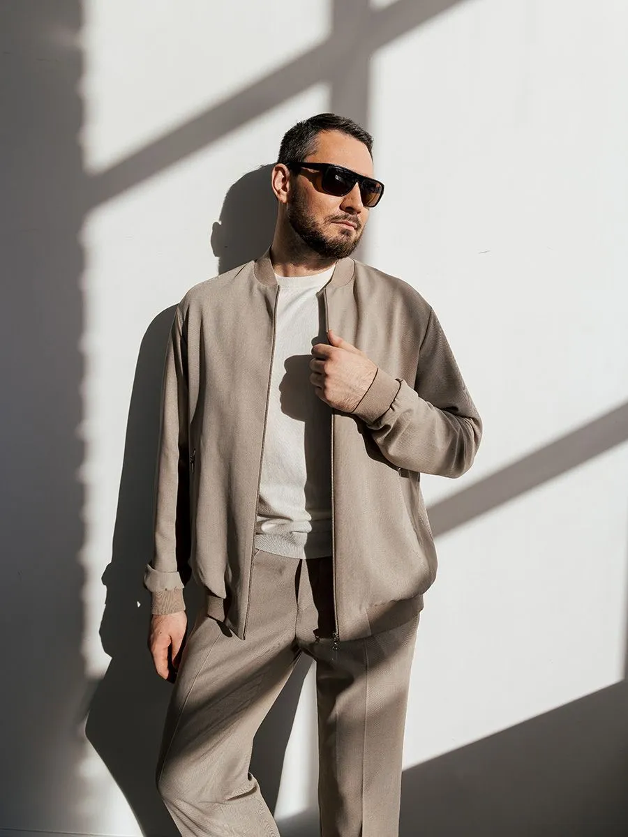 Бомбер из костюмной ткани бежевого цвета – это стильная и современная модель, которая идеально дополнит гардероб каждого современного мужчины. Пиджак отличается элегантным и сдержанным дизайном, который подходит под любой стиль одежды.Особенностью этого бомбера является фактурный однотонный рисунок ткани, который добавляет оригинальности и индивидуальности этой модели. Активный принт на подкладке создает акцент и делает этот бомбер еще более интересным.Практичность и удобство также не остаются в стороне у этой модели. Боковые прорезные карманы на молнии позволяют хранить необходимые мелочи всегда под рукой в безопасности. А резинки на вороте, манжетах и по низу бомбера обеспечивают идеальную посадку на фигуре и комфорт при носке.Идеальное дополнение к этому бомберу – это прямые брюки из такой же ткани, а именно модель TR24127-212-1.