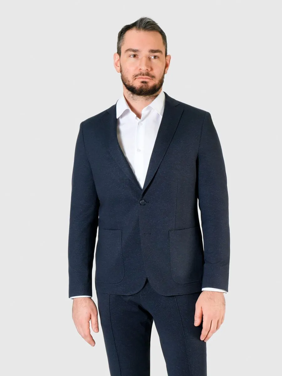 Мужской трикотажный пиджак приталенного силуэта из ткани с изысканным микродизайном. Пиджак цепляет внимание накладными карманами, а универсальный цвет придает строгости образу. Он идеально подходит для особых случаев, когда требуется безупречный внешний вид. За счёт своего синего оттенка и тщательно проработанного дизайна, этот пиджак выглядит ультрамодным и эксклюзивным. Приталенный силуэт подчёркивает мужественные черты стройной фигуры и создаёт элегантный и современный образ. Будьте в центре внимания с этим прекрасным трикотажным пиджаком.