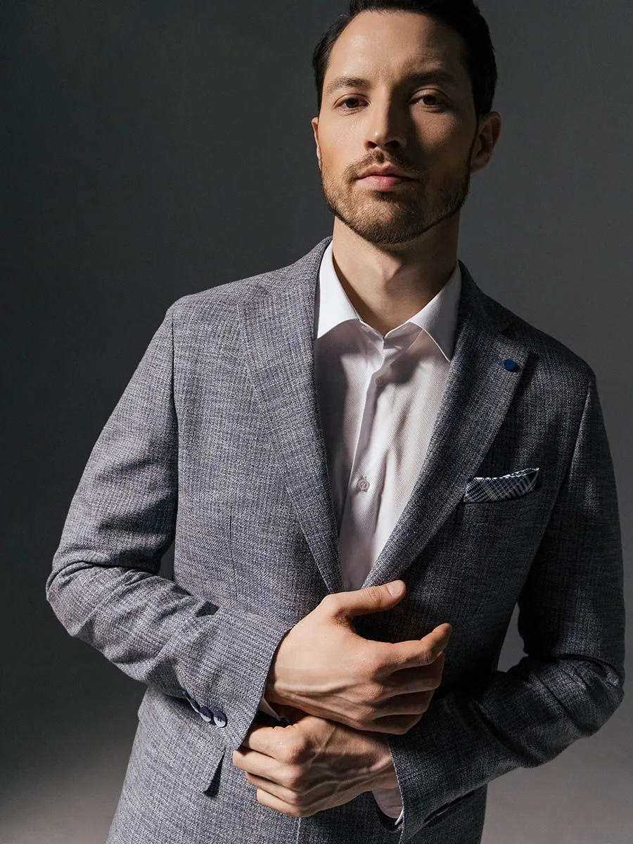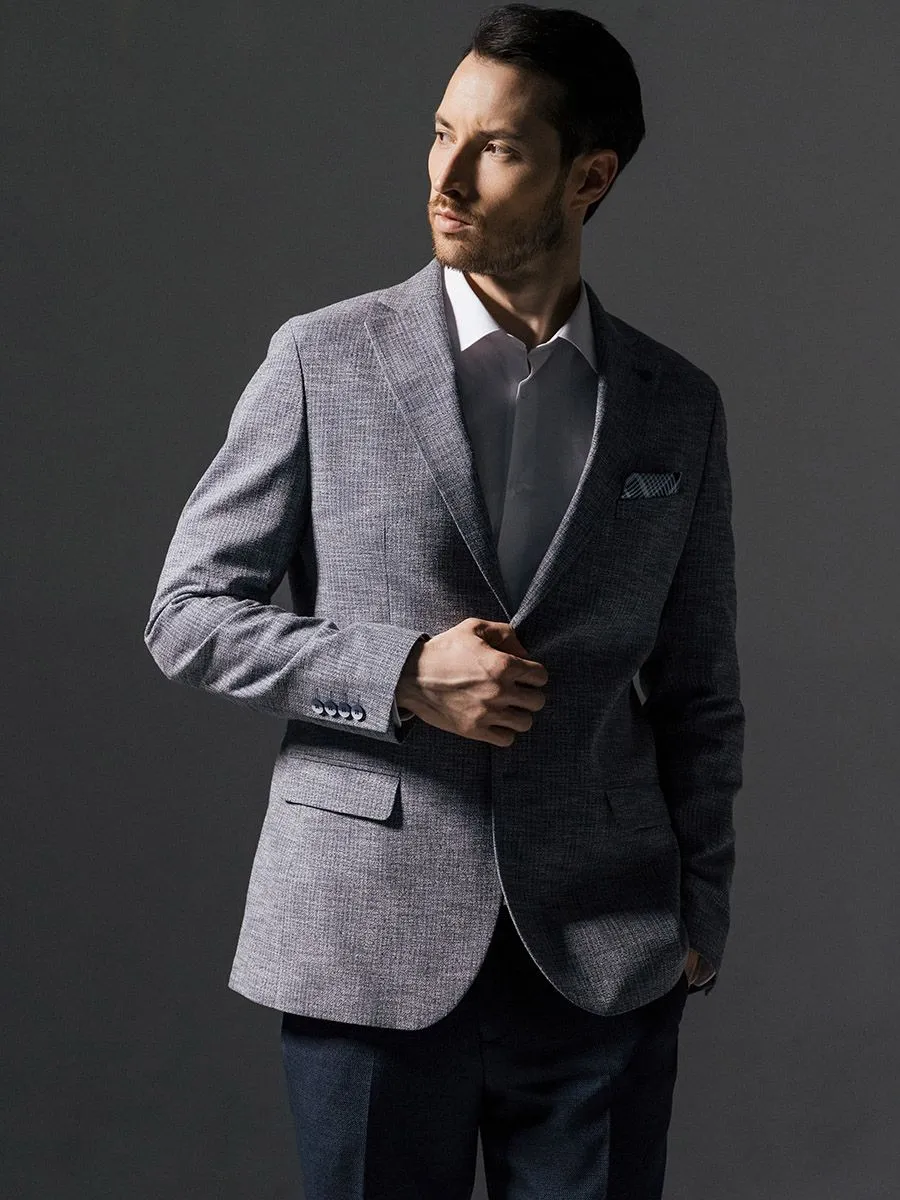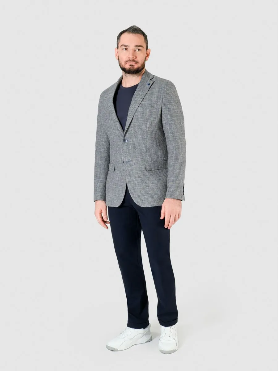 Полуприлегающий мужской пиджак в серо-голубом оттенке с меланжевым эффектом – это прекрасное дополнение к гардеробу каждого стильного мужчины. Его отличительной особенностью являются акцентные пуговицы синего цвета, которые добавляют шарм и изысканность этому изделию. Этот пиджак настоящая находка. Он идеально подходит для создания как классического образа, с сорочкой и соответствующими брюками, так и повседневного - с футболкой и кедами. В классическом варианте он придает неподдельную элегантность и респектабельность, подчеркивая статус своего обладателя. В повседневных сочетаниях он олицетворяет свежесть, легкость и стиль, позволяя мужчине чувствовать себя уверенно и комфортно в любой ситуации.Натуральные и качественные материалы, из которых он изготовлен (в составе пиджака 35% хлопка), обеспечат комфорт и удобство в носке. Ткань приятная на ощупь, дышащая и не сковывающая движений. Изделие изготовлено с большим вниманием к деталям, что придает ему высокое качество и прочность.