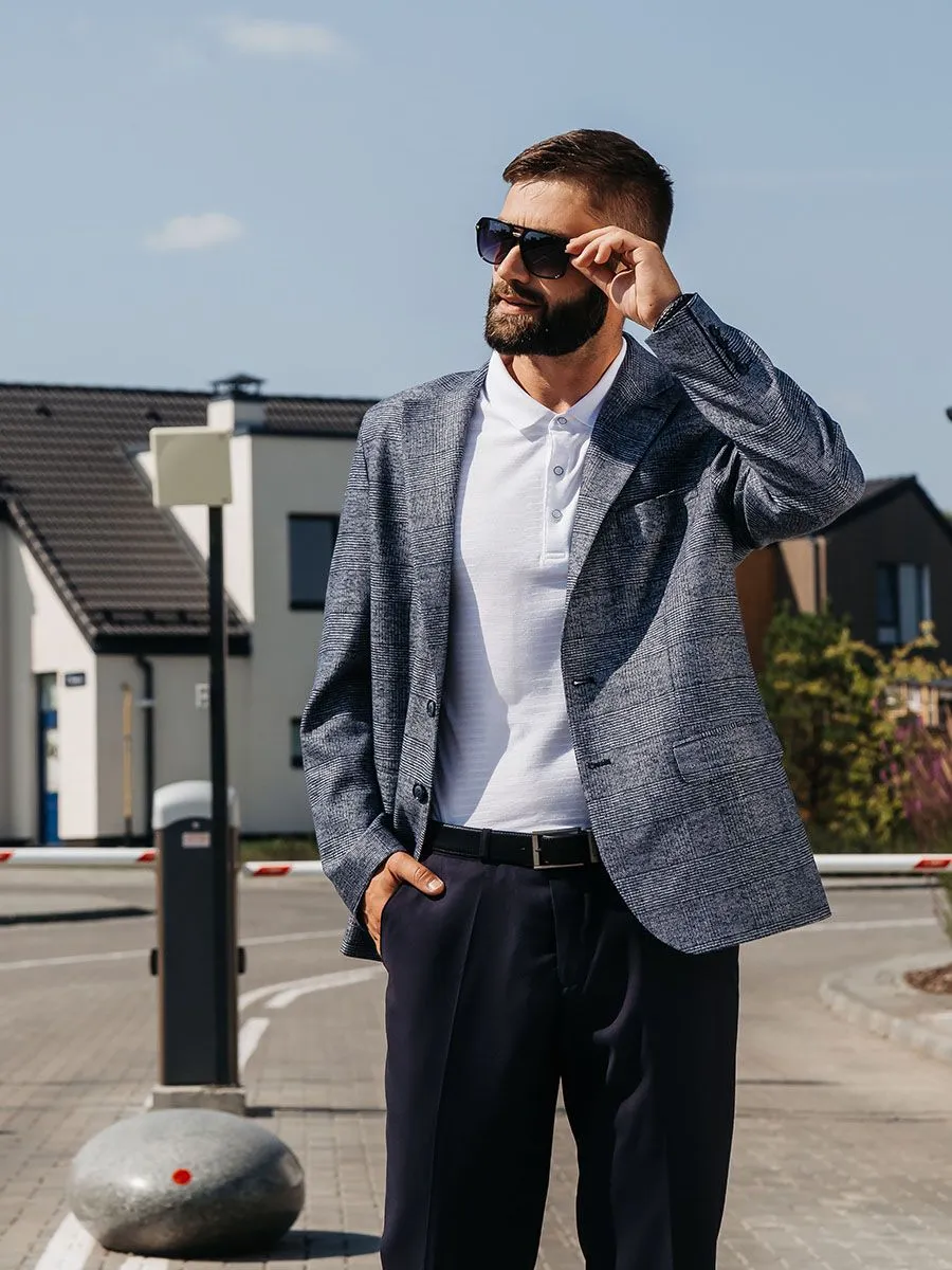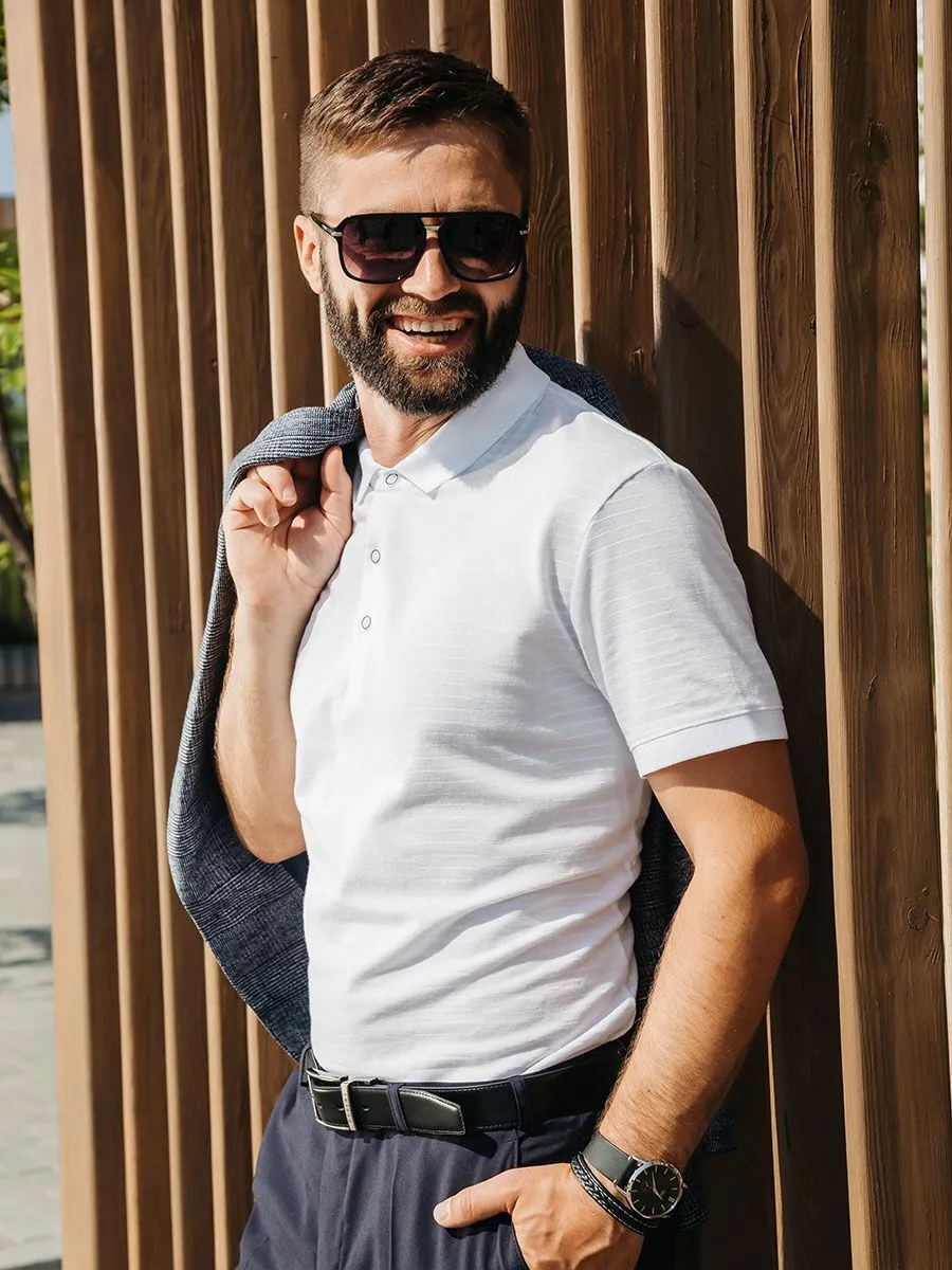 Белое трикотажное поло для мужчины послужит базисом множества образов. Поло имеет необычную фактуру в виде горизонтальных линий, которые то пояляются, то растворяются в ткани, что создает некоторую иллюзию. 100% высококачественный хлопок делает поло мягким, комфортным и дышащим. В данном образе используется пиджак JA23019-R.