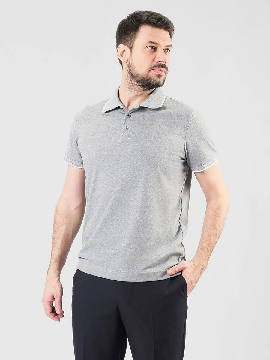 Серое мужское поло. Модель с отложным меланжевым воротником в тон основной ткани.Изделие изготовлено из смесовой меланжевой ткани, где хлопок отвечает за гигроскопичность, ПЭ – за мягкость и шелковистость, а одним из ключевых преимуществ лайкры является ее способность вернуться в исходное положение после растяжения. Благодаря этому трикотажное поло сохраняет свою форму даже после многократных стирок и активной носки.Лёгкая фактурность ткани не только приятна на ощупь, но и визуально добавляет поло глубины и интереса. Меланжевый оттенок серого, полученный путем смешения нескольких тонов волокон, создает эффект деликатной неоднородности, что делает поло более выразительным и универсальным в плане сочетаемости с другими элементами гардероба.Классический крой поло обеспечивает комфортную посадку и свободу движений. Короткие рукава, аккуратно обработанные края и застежка на пуговицы подчеркивают элегантность и лаконичность дизайна. Это позволяет носить поло как в формальной обстановке, например, с брюками чинос и пиджаком, так и в более расслабленном стиле, сочетая его с джинсами или шортами.