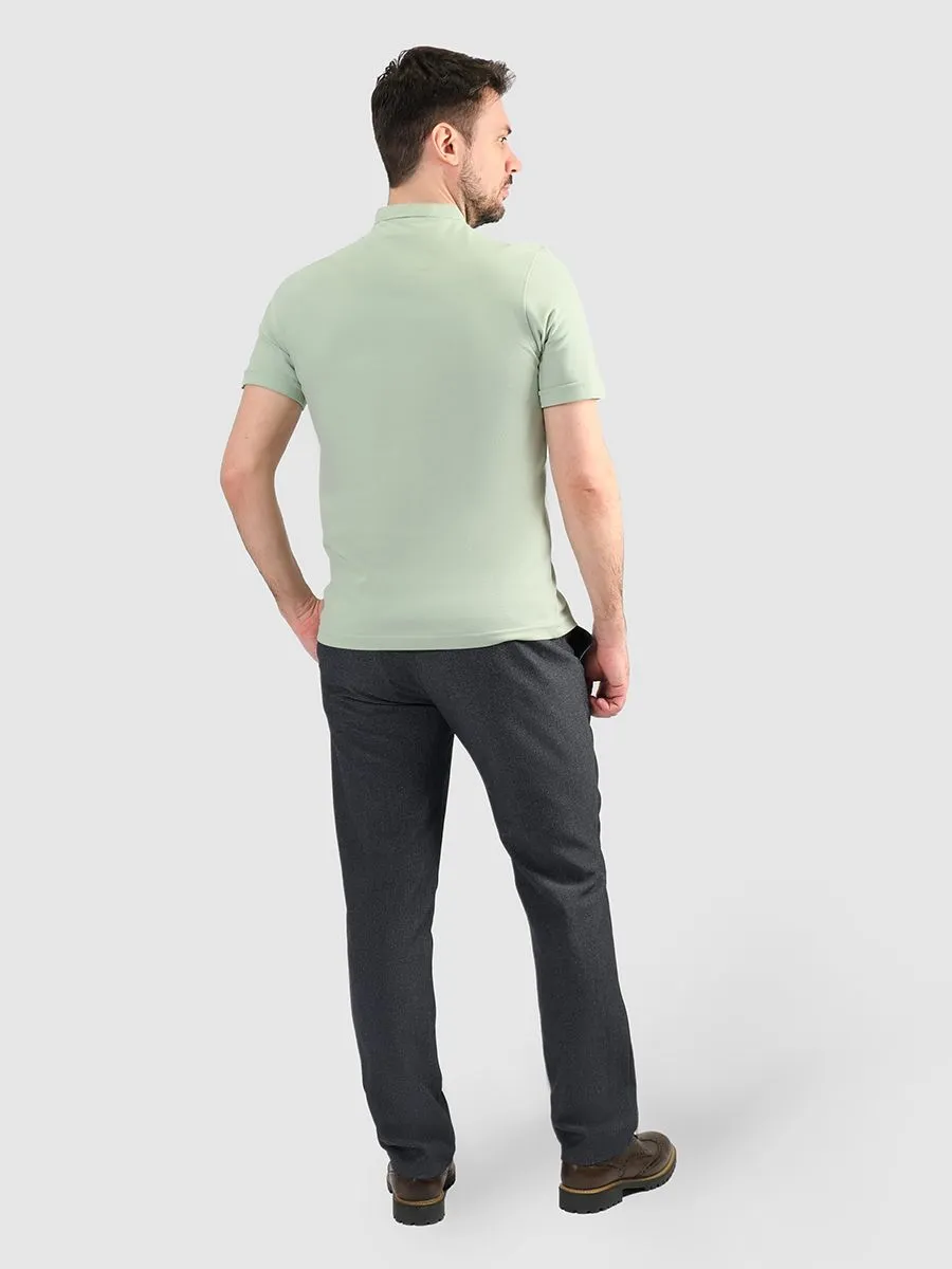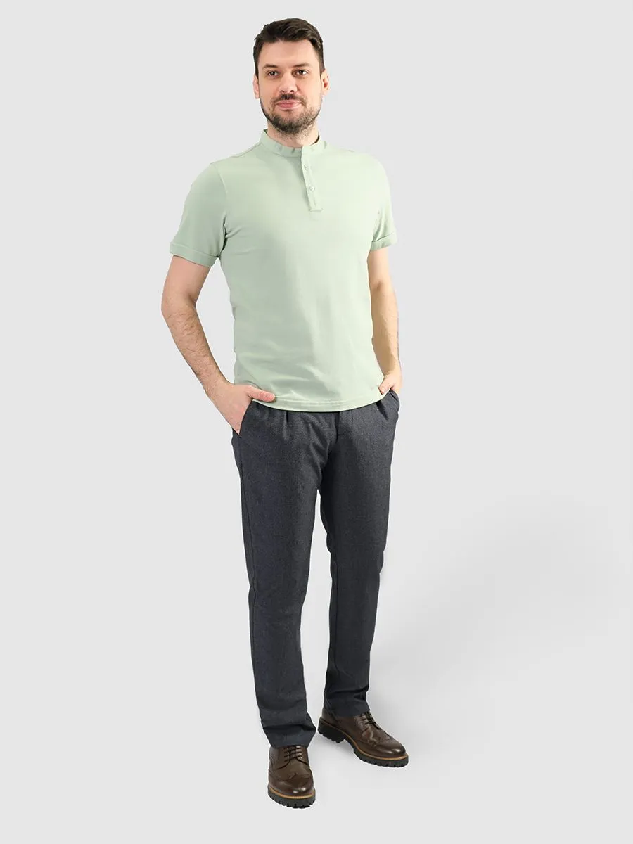 Эта модель поло создана для мужчин, ценящих минимализм и функциональность в одежде. Отсутствие верхней пуговицы подчеркивает современный и непринужденный характер изделия, позволяя с легкостью адаптировать его под различные стили и случаи. Воротник-стойка придает образу элегантность и строгость, выделяя поло среди традиционных моделей с отложным воротником.Мягкий хлопок обеспечивает комфорт и приятные тактильные ощущения в течение всего дня. Ткань хорошо дышит, позволяя коже оставаться сухой и свежей даже в теплую погоду.Зеленый цвет поло – это универсальное решение, легко сочетаемое с различными элементами гардероба. Он прекрасно гармонирует с джинсами, чиносами и даже классическими брюками. Однотонный дизайн подчеркивает сдержанность и элегантность модели, делая ее подходящей как для повседневной носки, так и для создания более формальных образов.Поло с воротником-стойкой станет отличным выбором для мужчин, стремящихся к созданию стильного и лаконичного образа. Оно идеально подойдет для работы в офисе, встреч с друзьями, прогулок по городу и других повседневных занятий. Эта модель поло – это прекрасное сочетание комфорта, качества и стиля.