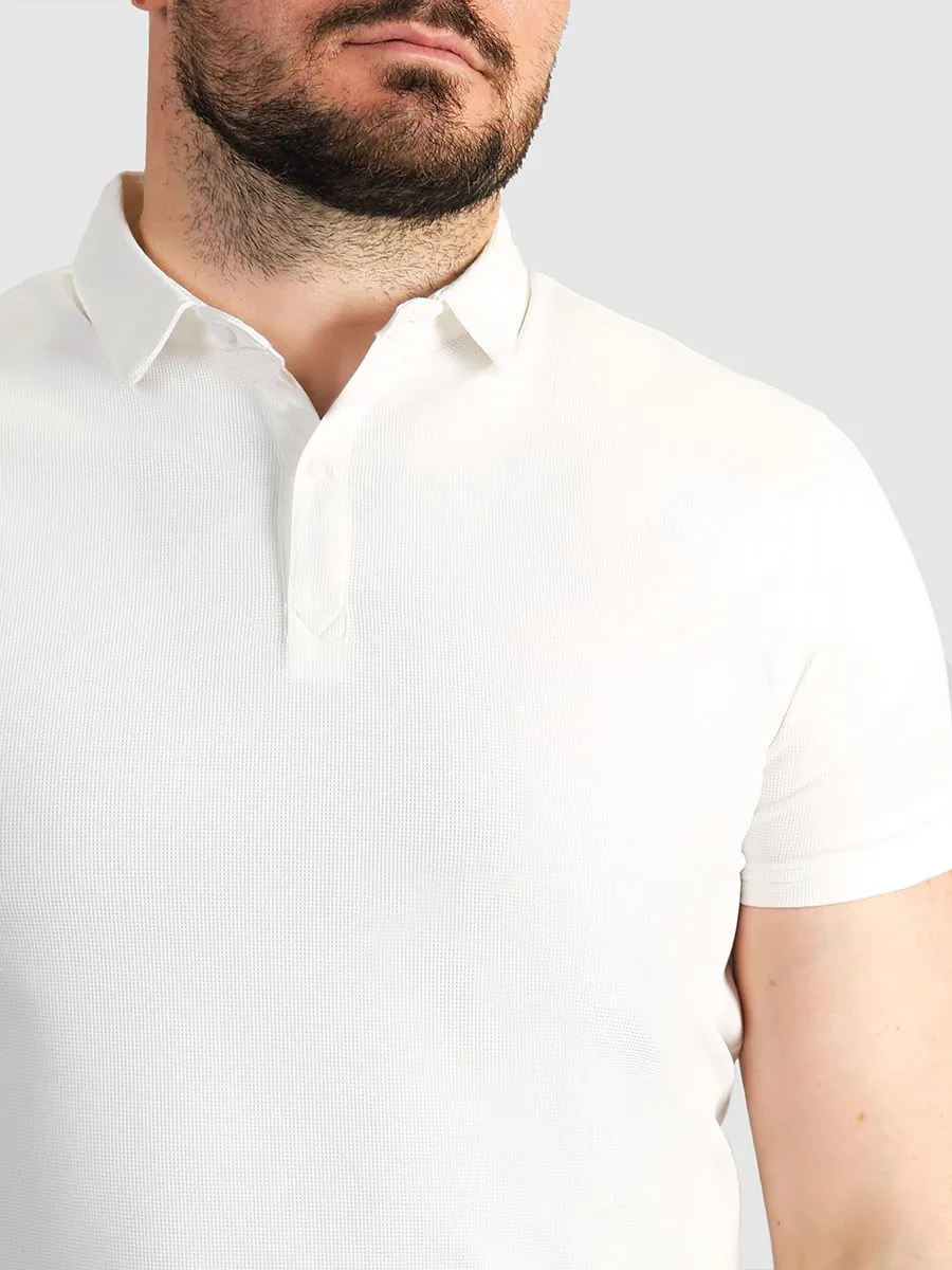 Благодаря прямому силуэту, поло обеспечивает свободу движений, что особенно важно в динамичном ритме современной жизни. Отложной воротник из основной ткани добавляет образу нотку элегантности, позволяя носить это поло как на неформальные встречи, так и в офис, если дресс-код не слишком строгий.Жаккардовая фактура в виде «вафельного» рисунка придает ткани особую выразительность и глубину. Этот ненавязчивый, но заметный узор делает поло более интересным и визуально привлекательным, чем обычные однотонные модели. Белый цвет подчеркивает свежесть и легкость образа, делая его универсальным для сочетания с различными элементами гардероба.Отрезная планка на пуговицах – это классический элемент поло, который добавляет образу завершенности и аккуратности. Этот поло станет незаменимой вещью в гардеробе любого мужчины, который ценит качество, комфорт и стиль в одежде.