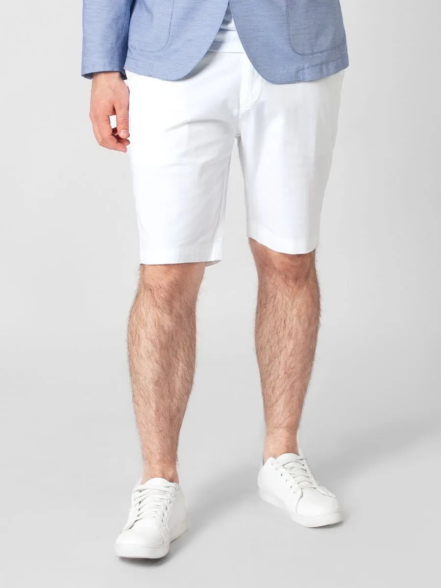 Шорты силуэта SL понравится молодым парням и статным мужчинам, предпочитающим узкие брюки и шорты средней длины по колено. Изделие из ткани белого цвета с твиловым переплетением. Внутренняя часть пояса отделана 3 красными строчками, добавляющими нотку морского стиля. Сочетание с белой футболкой с принтом TS19108-R и светлым пиджаком JA19020-SL будет смотреться выигрышно.