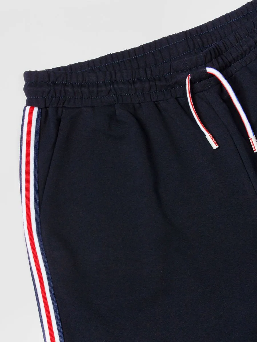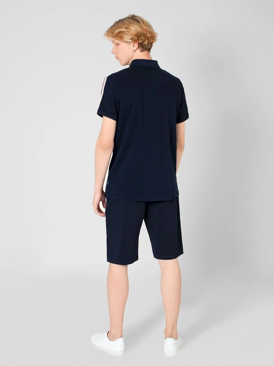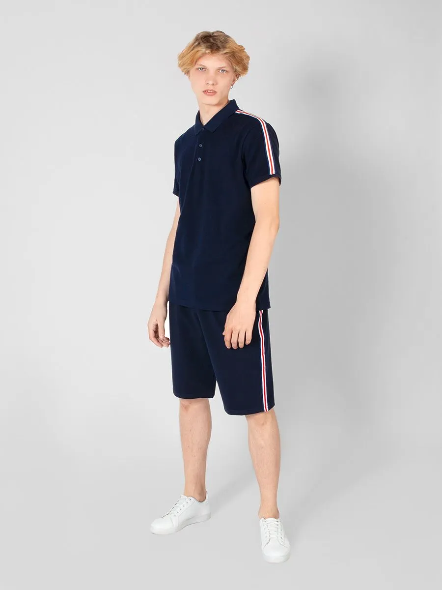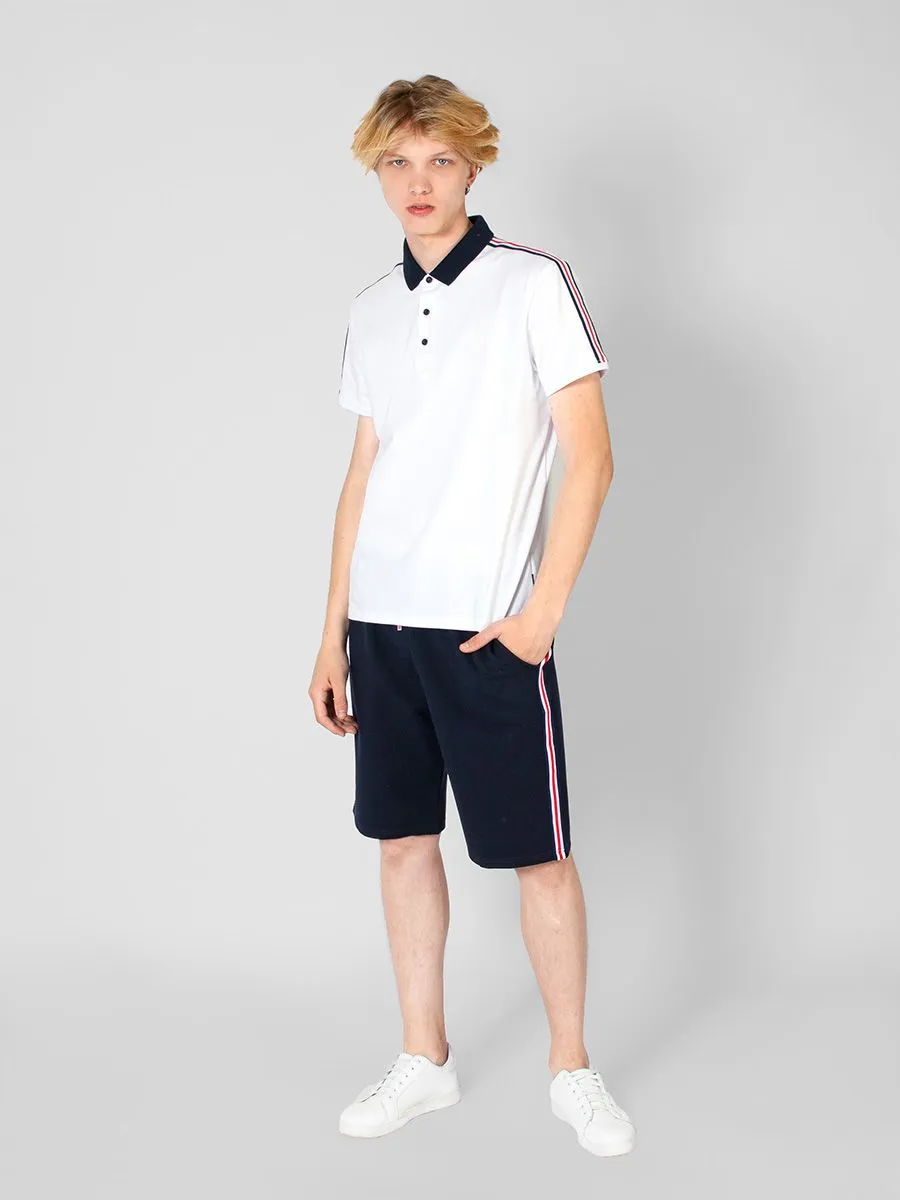 Хлопковые шорты от Peplos имеют прямой крой и выполнены из ткани темно-синего цвета с ярким акцентом в виде лампас по бокам. Также у шорт два удобных боковых кармана и шнурок на поясе под цвет лампас. Шорты можно сочетать с белой футболкой с лампасами РУБАШКА-ПОЛО МУЖ. PEPLOS TS21007-P или с темно-синей РУБАШКА-ПОЛО МУЖ. PEPLOS TS21015-P.