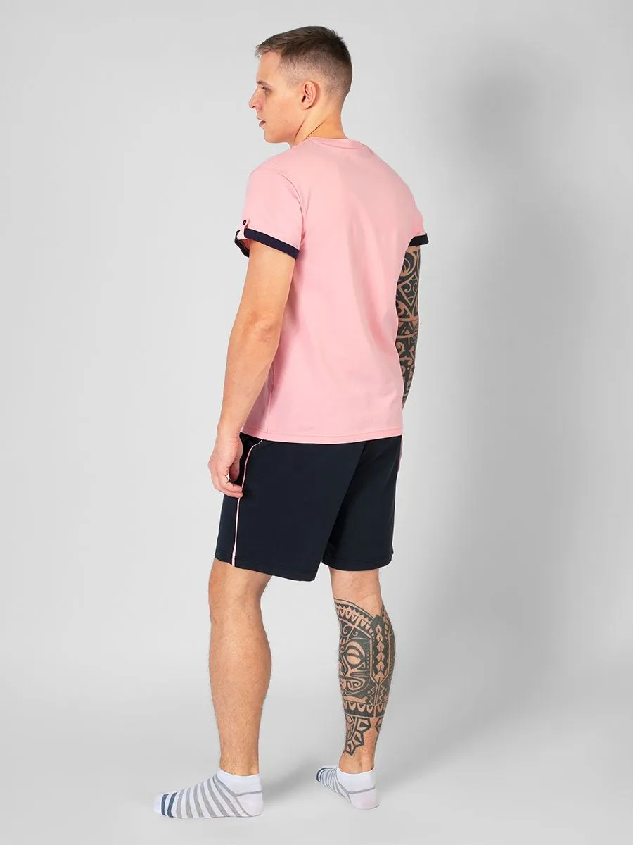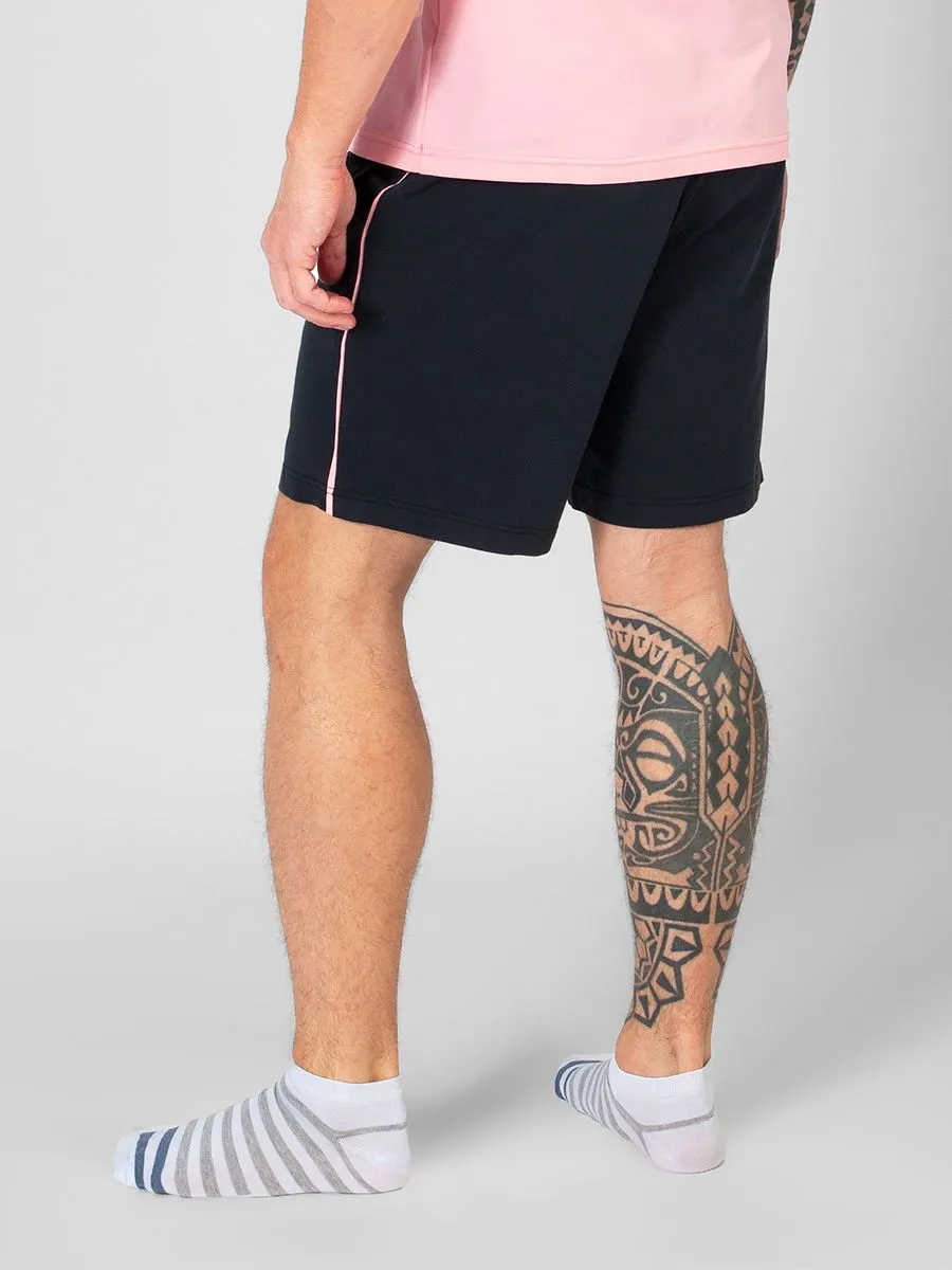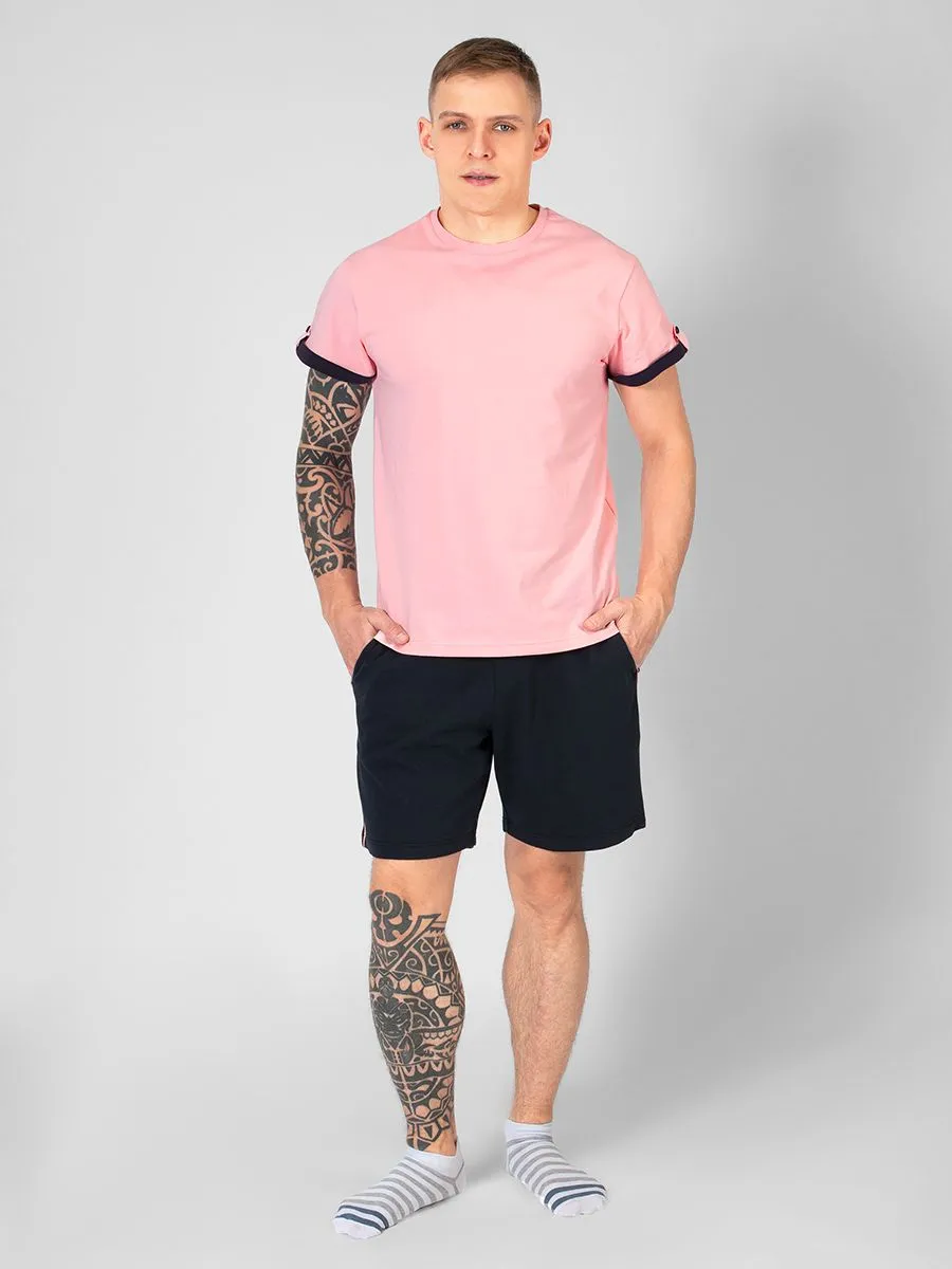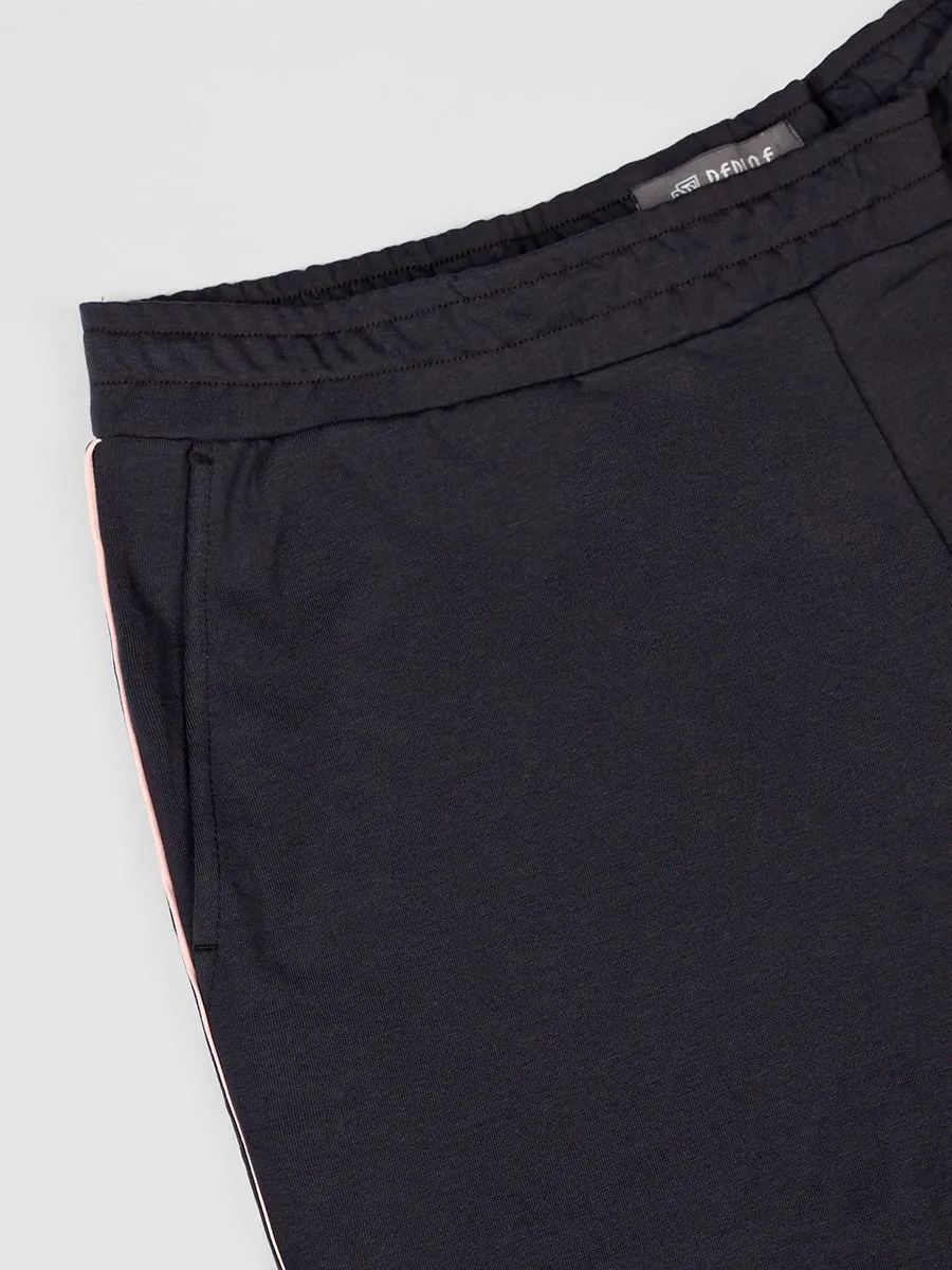 Трикотажные шорты темно-серого цвета, почти черные, имеют свободный силуэт на резинке. В таких шортах удобно заниматься спортом, домашними делами или просто отдыхать. Вертикальные тонкие полоски по бокам выполняют декоративную функцию и служат направлением для создания единого образа, например, в сочетании с футболкой TS22004-R.