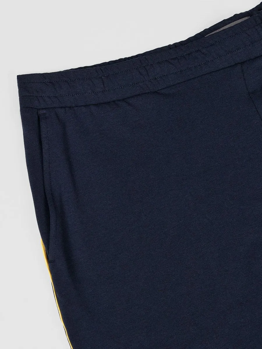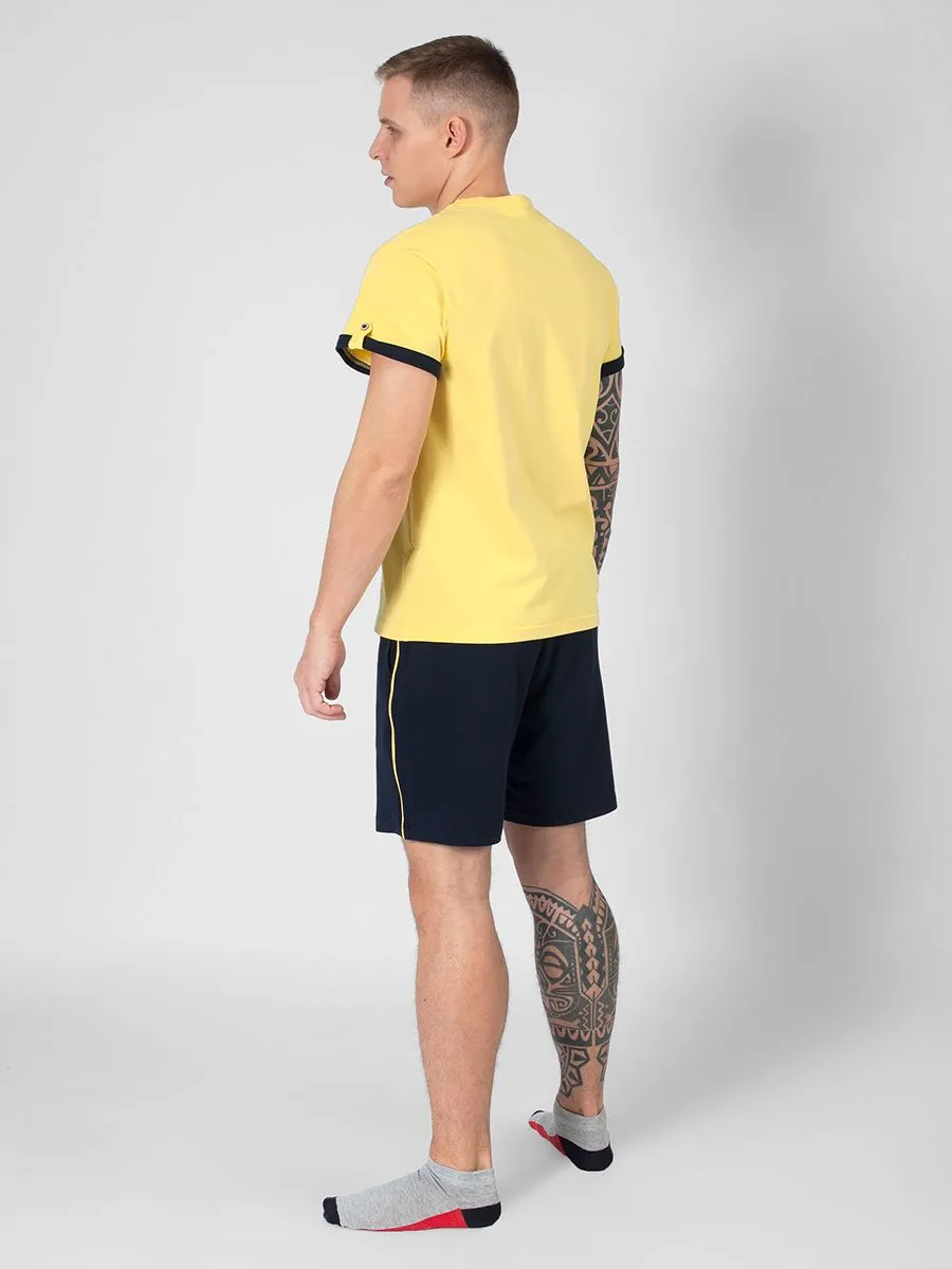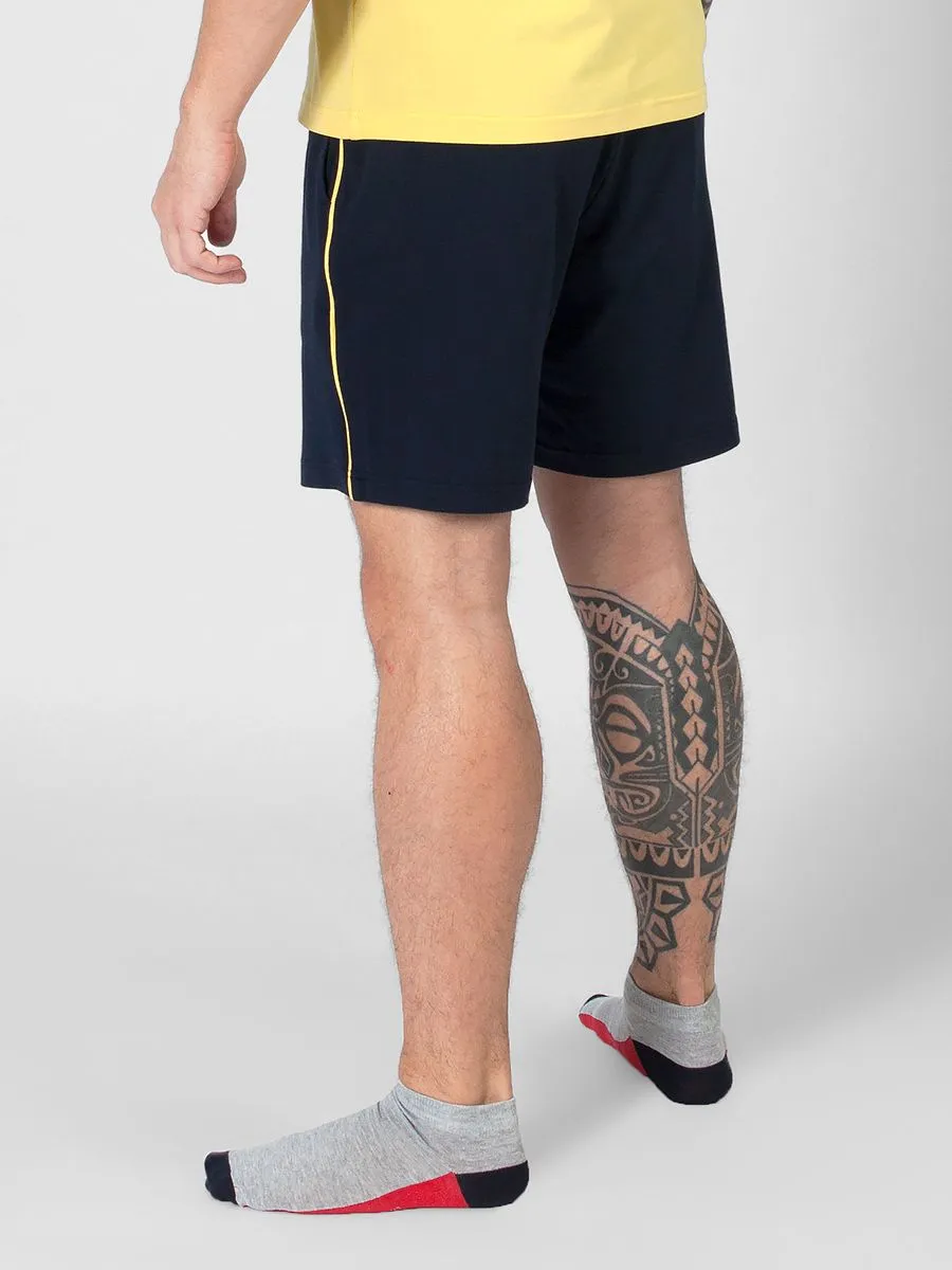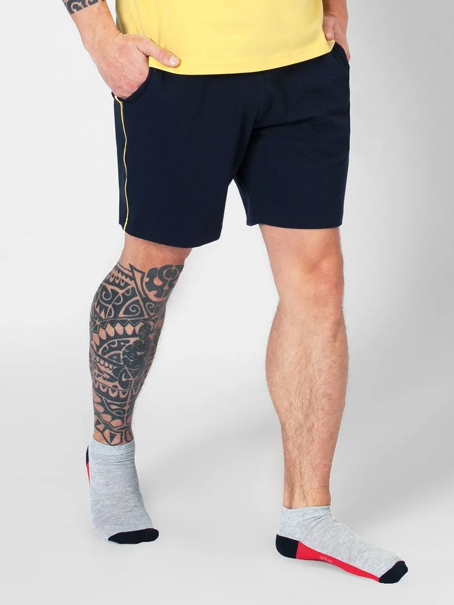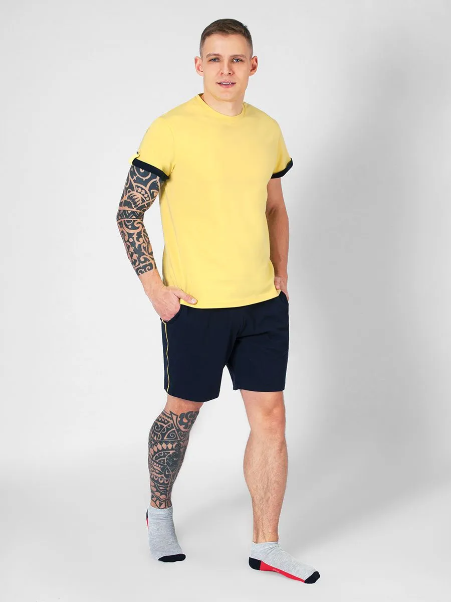 Шорты мужские трикотажные с карманами обладают множеством полезных характеристик. Во-первых, воздухопроницаемость и гигроскопичность благодаря хлопковому составу; во-вторых, хорошая растяжимость и эластичность благодаря присутствию эластана в составе; в-третьих, удобство носки благодаря поясу на резинке, свободному крою и боковым карманам; в-четвертых, универсальность и практичность благодаря немаркому темно-синему цвету. Декоративные желтые полосы по бокам шорт как бы намекают на вариант их сочетания с верхом, например, футболка в тон TS22005-R.