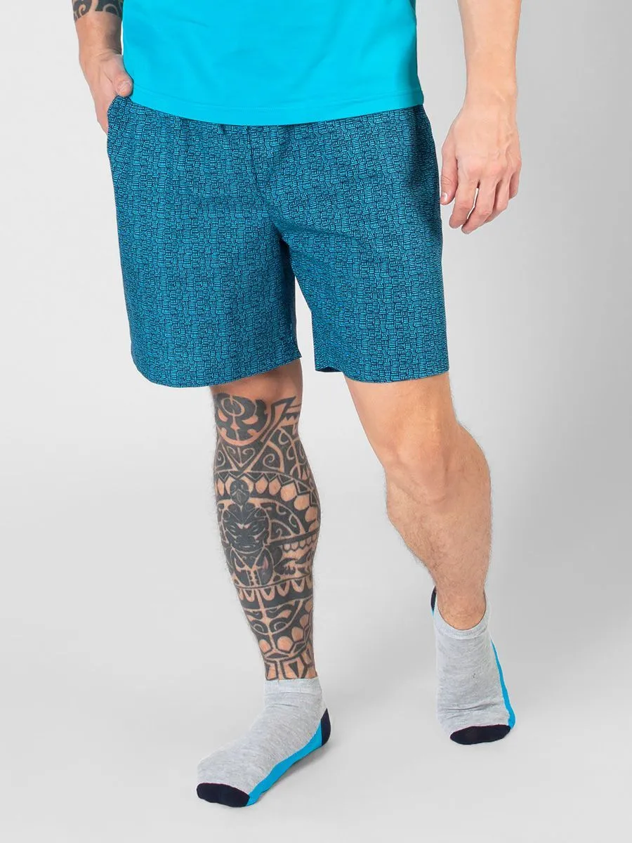 Шорты мужские выполнены в свободном крое на эластичной резинке. 100% хлопок, из которого изготовлены шорты, обеспечивает комфорт и свежесть в жаркое время года. Красивый цвет с бирюзовым оттенком будет особенно гармонично выглядеть во время пляжного отдыха на фоне озера или моря. С таким сложным принтом лучше всего сочетать однотонную футболку, например, футболка TS22003-R идеально подходит под тон шорт.