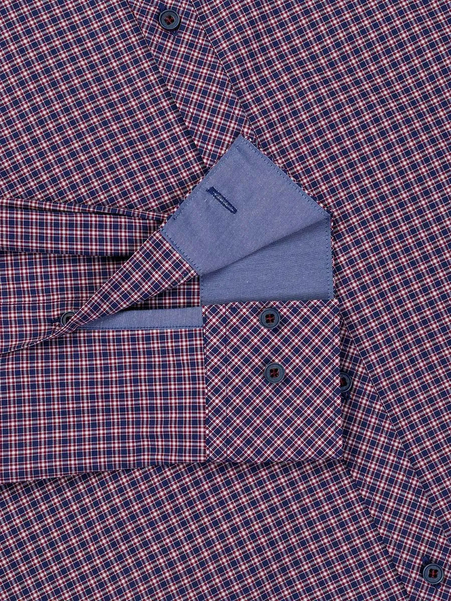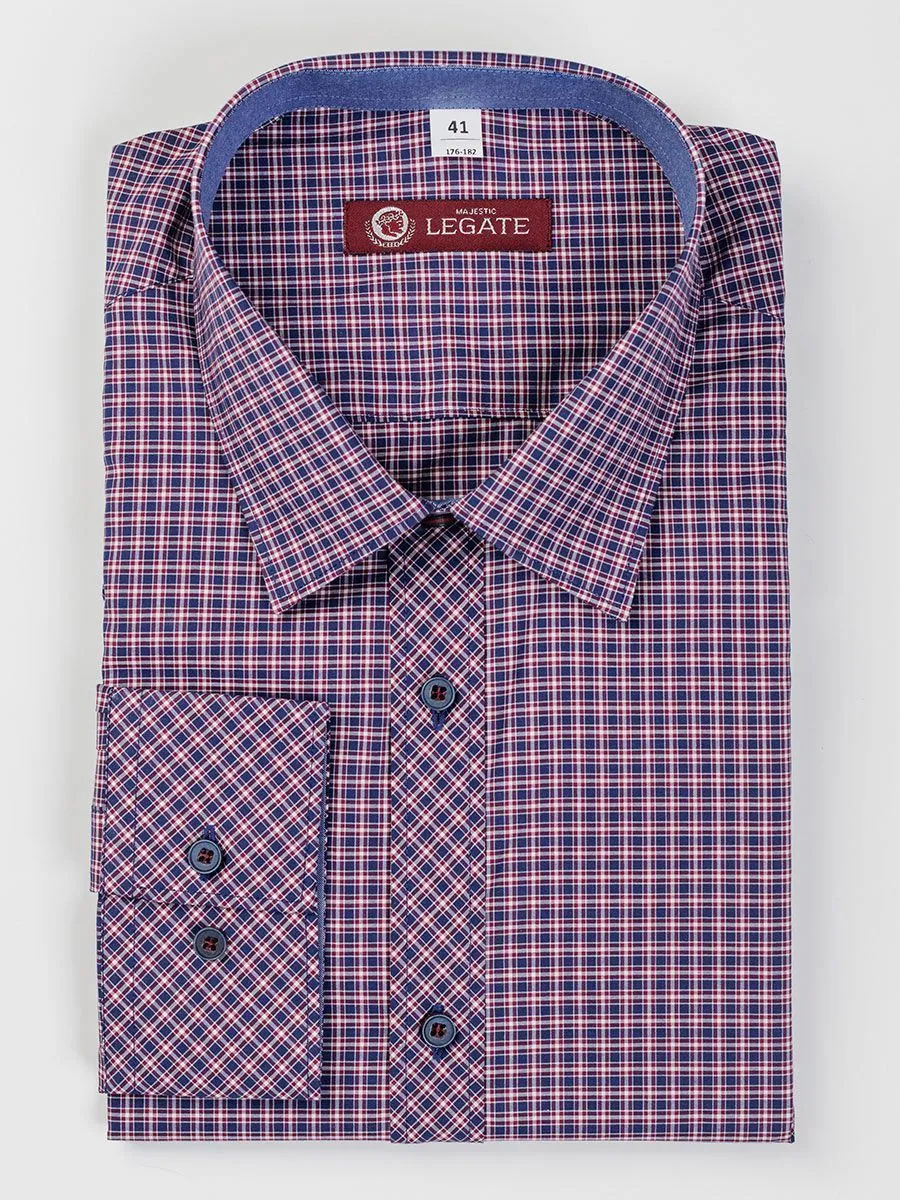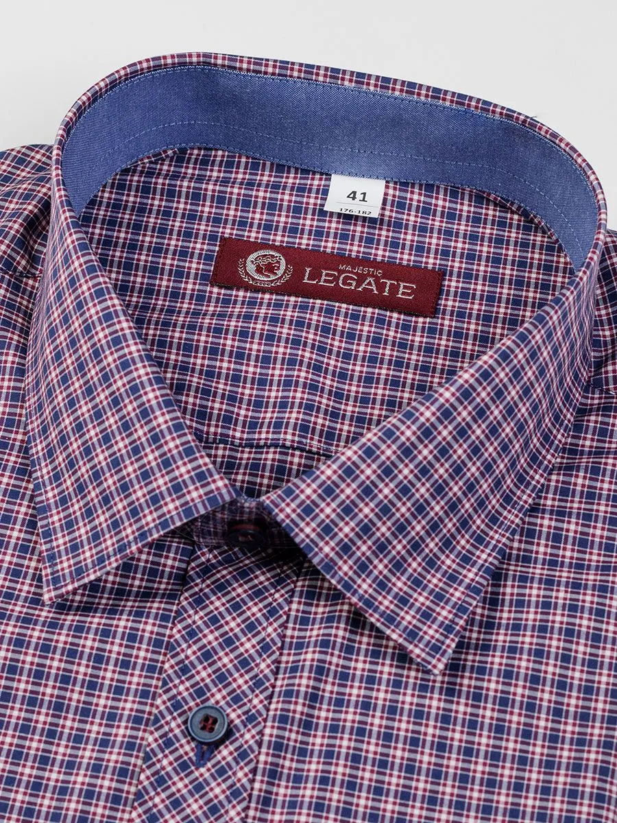 Сорочка линейки Majestic Legate выполнена в приталенном силуэте из ткани в яркую клетку со множеством интересных деталей. У основной ткани меняется направление рисунка в отделке деталей- на манжетах рукавов, планке и сзади на кокетке. Манжеты и воротник изнутри прошиты контрастной синей хлопковой тканью. Из этой же ткани сзади на спинке сделана декоративная петелька. Данная модель будет отлично сочетаться с брюками в стиле casual, а приталенный силуэт и необычная расцветка подчеркнут вашу фигуру и стиль.