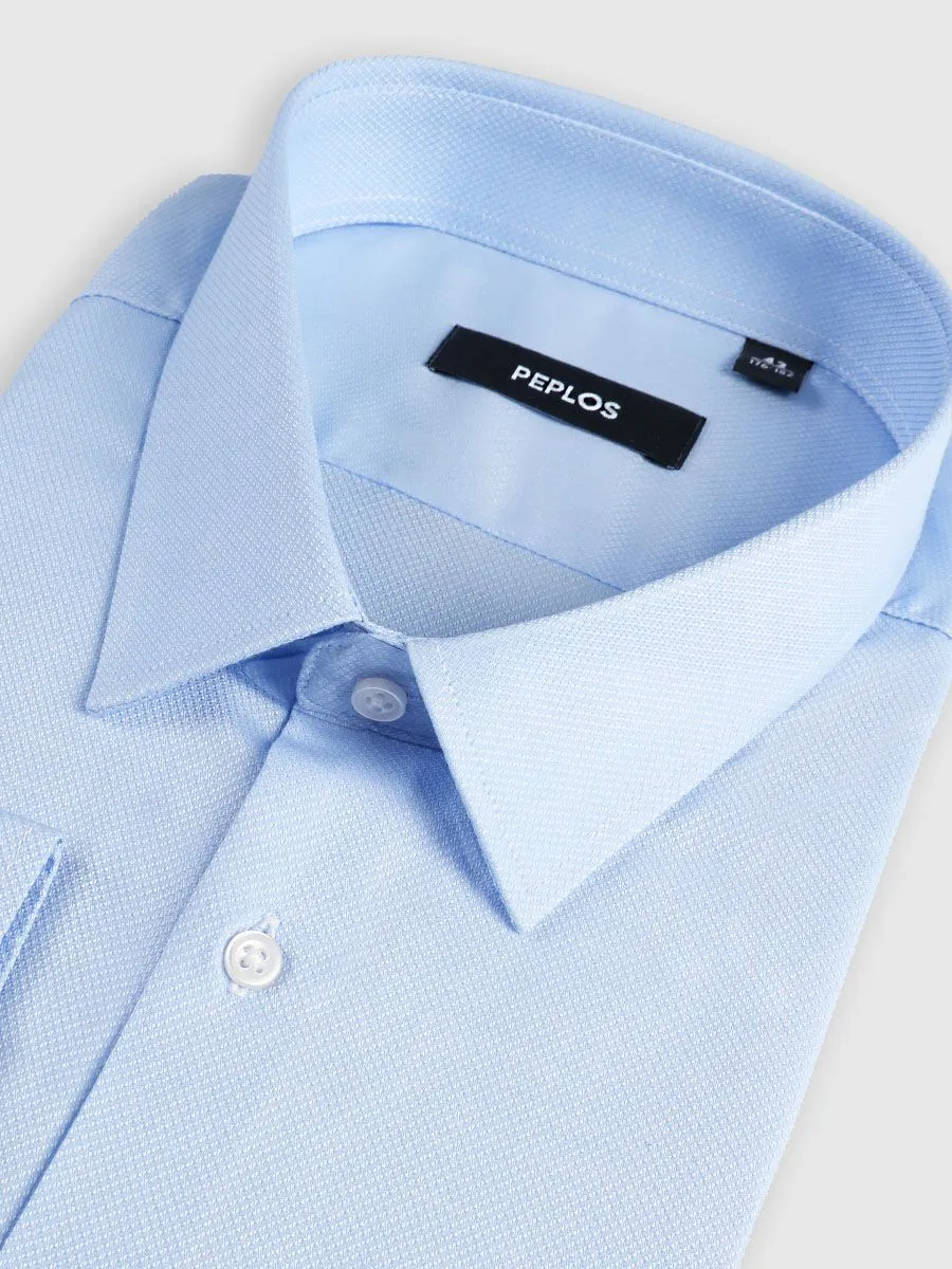 Мужская сорочка с длинным рукавом прямого силуэта представлена в голубом оттенке. Дополнительный объём обеспечивается за счёт двух мягких складок по линии притачивания кокетки на спинке. Сорочка выполнена из фактурной ткани с применением дополнительной обработки LA, благодаря чему изделие приобретает благородный блеск и шелковистость, меньше мнется и исключает усадку.