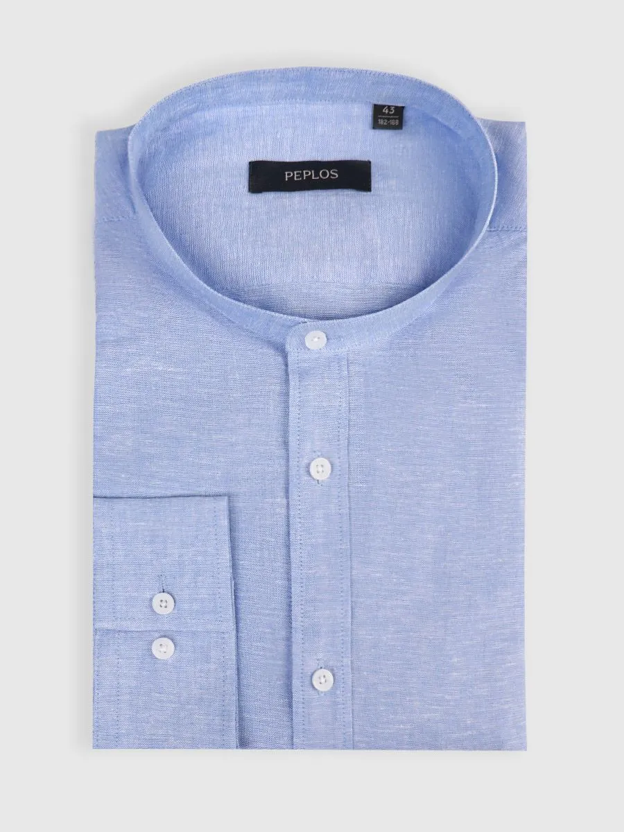 Голубая сорочка, воротник стойка. Состав: Хлопок: 45%, Лен: 55%. Силуэт сорочки полуприлегающий. Модель с укороченной длиной изделия и треугольными вставками по боковым швам. Прямоугольный манжет, декоративная планка по передней полочке.