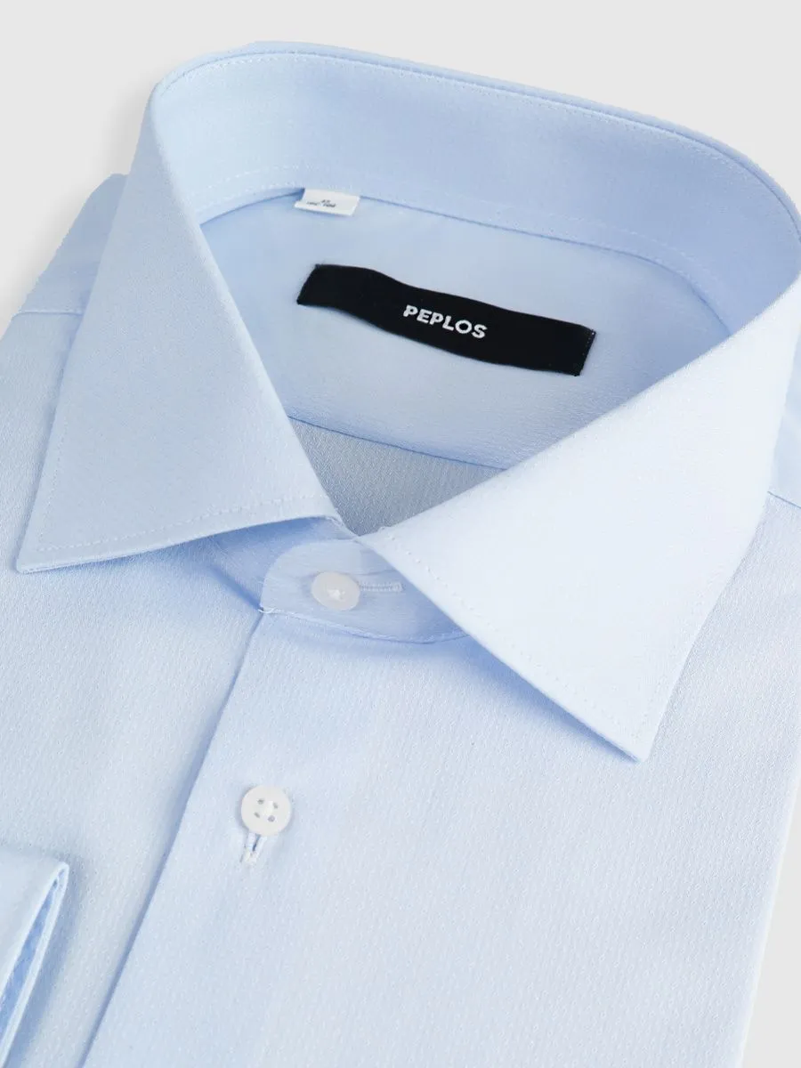 Голубая мужская сорочка представлена в приталенном силуэте. Приталенный силуэт подчеркивает достоинства фигуры, не сковывая движений, что делает ее подходящей как для офисного дресс-кода, так и для более расслабленной обстановки. Фактурная ткань добавляет глубины и визуального интереса, отличая эту модель от обыденных рубашек.Широко расставленный воротник – деталь, позволяющая носить сорочку как с галстуком, так и без него, создавая различные образы в зависимости от случая. Он отлично сочетается с узкими и широкими галстуками, а также эффектно выглядит с расстегнутыми верхними пуговицами, придавая образу непринужденность.