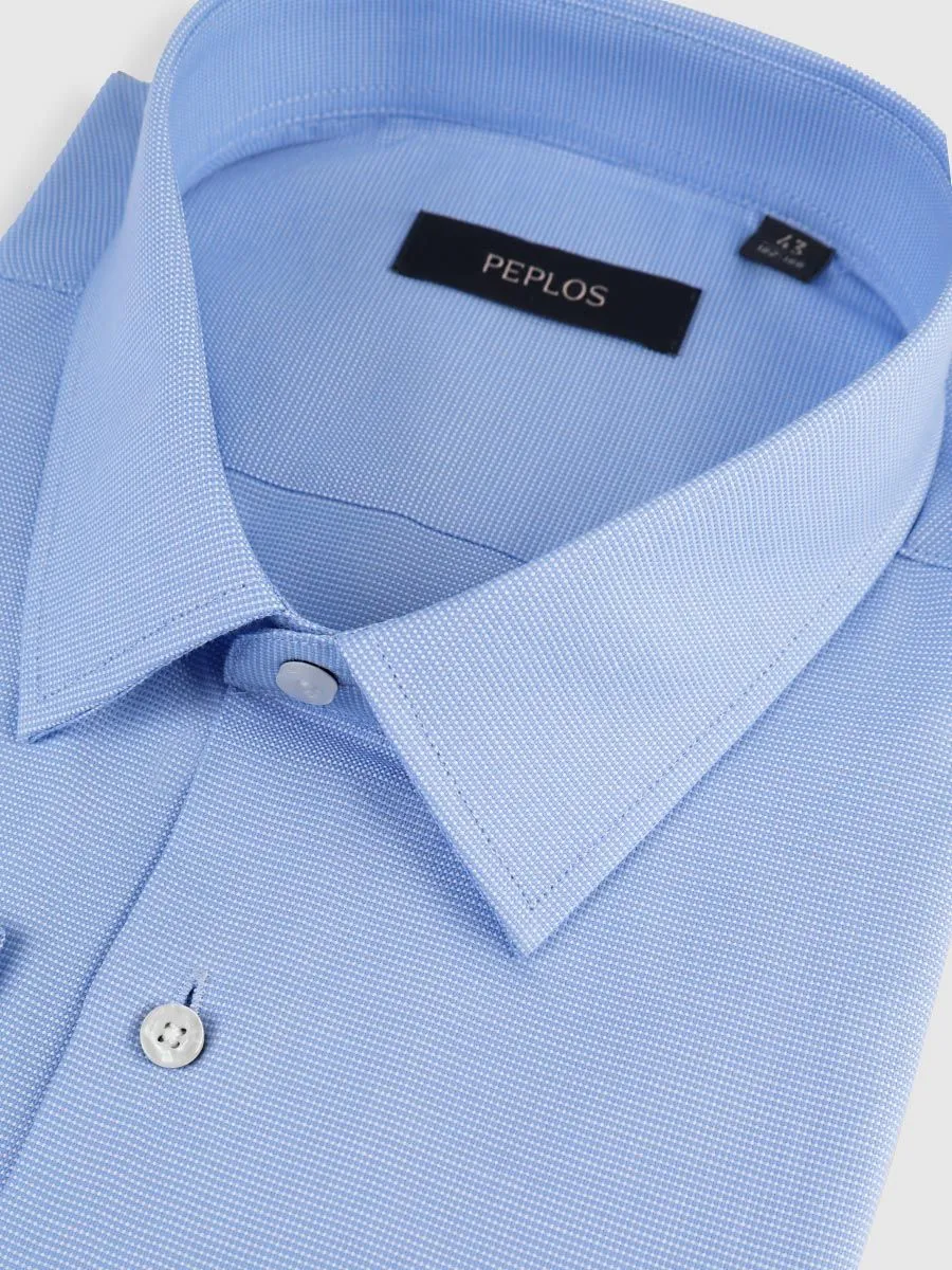 Синяя мужская сорочка с длинным рукавом приталенного силуэта. Выполнена из фактурной ткани в базовой модели.Ее универсальность позволяет создавать разнообразные образы, от деловых до непринужденно-повседневных. Ткань, обладающая легкой фактурой, добавляет изделию глубины и интереса, выделяя его среди гладких аналогов. Приталенный силуэт подчеркивает достоинства фигуры, не сковывая движений, что обеспечивает комфорт в течение всего дня.