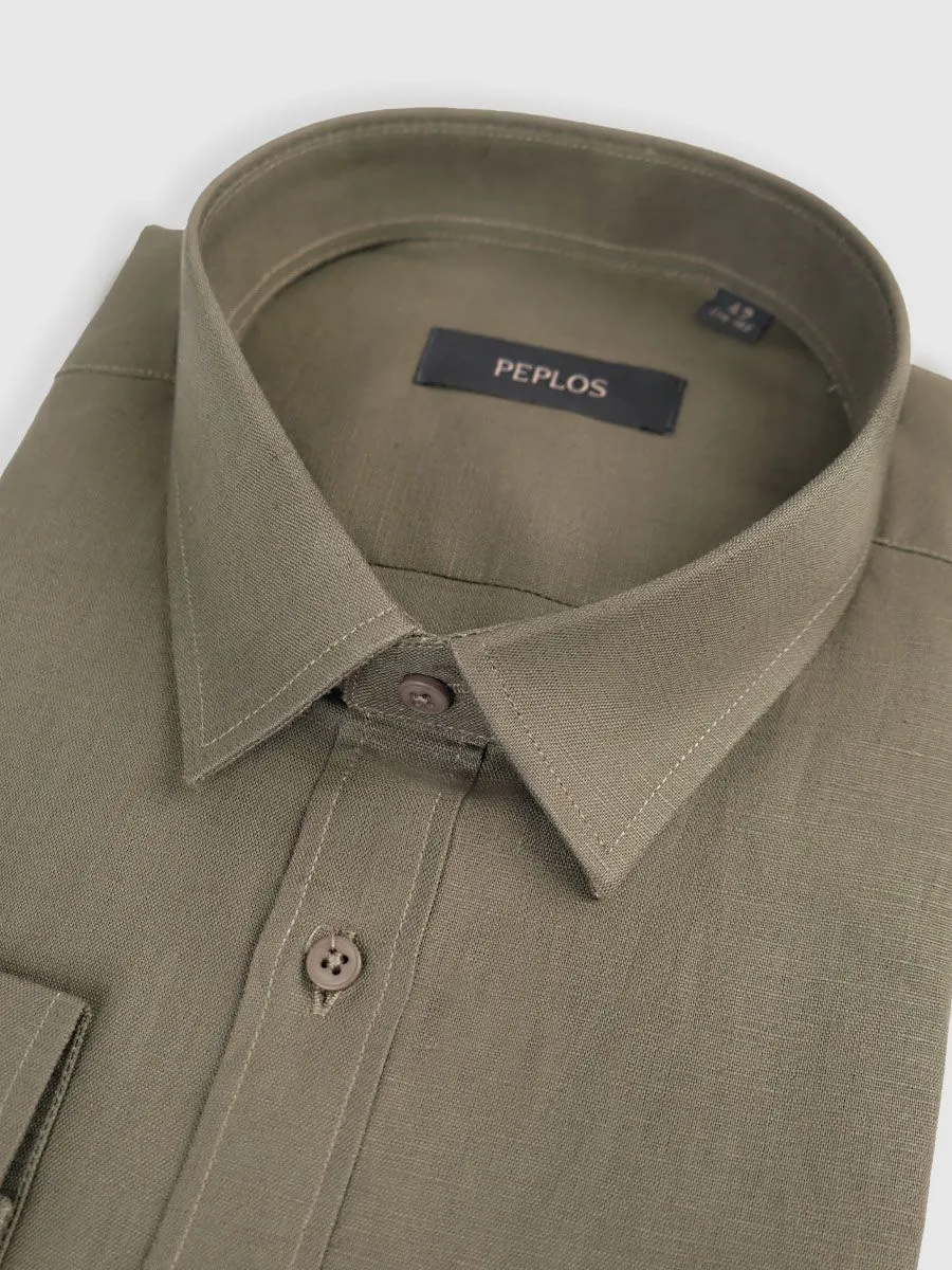 Сорочка выполнена из смесовой ткани, сочетающей в себе натуральность льна и практичность хлопка. Лен придает изделию легкую фактурность, приятную прохладу в жаркую погоду и характерную мятость, которая добавляет образу небрежной элегантности. Хлопок, в свою очередь, обеспечивает мягкость и комфорт при носке, а также повышает износостойкость ткани.Темно-зеленый цвет сорочки, глубокий и насыщенный, делает ее универсальным элементом гардероба. Он хорошо сочетается с различными оттенками брюк, от классического бежевого до более смелых, терракотовых или горчичных. Такая сорочка уместна как в офисе (в сочетании с пиджаком и строгими брюками), так и на неформальной встрече (в паре с джинсами или чиносами).Укороченная длина сорочки в сочетании с полуприлегающим силуэтом создает современный и стильный образ. Треугольные вставки по боковым швам обеспечивают свободу движений и подчеркивают мужественную фигуру.
