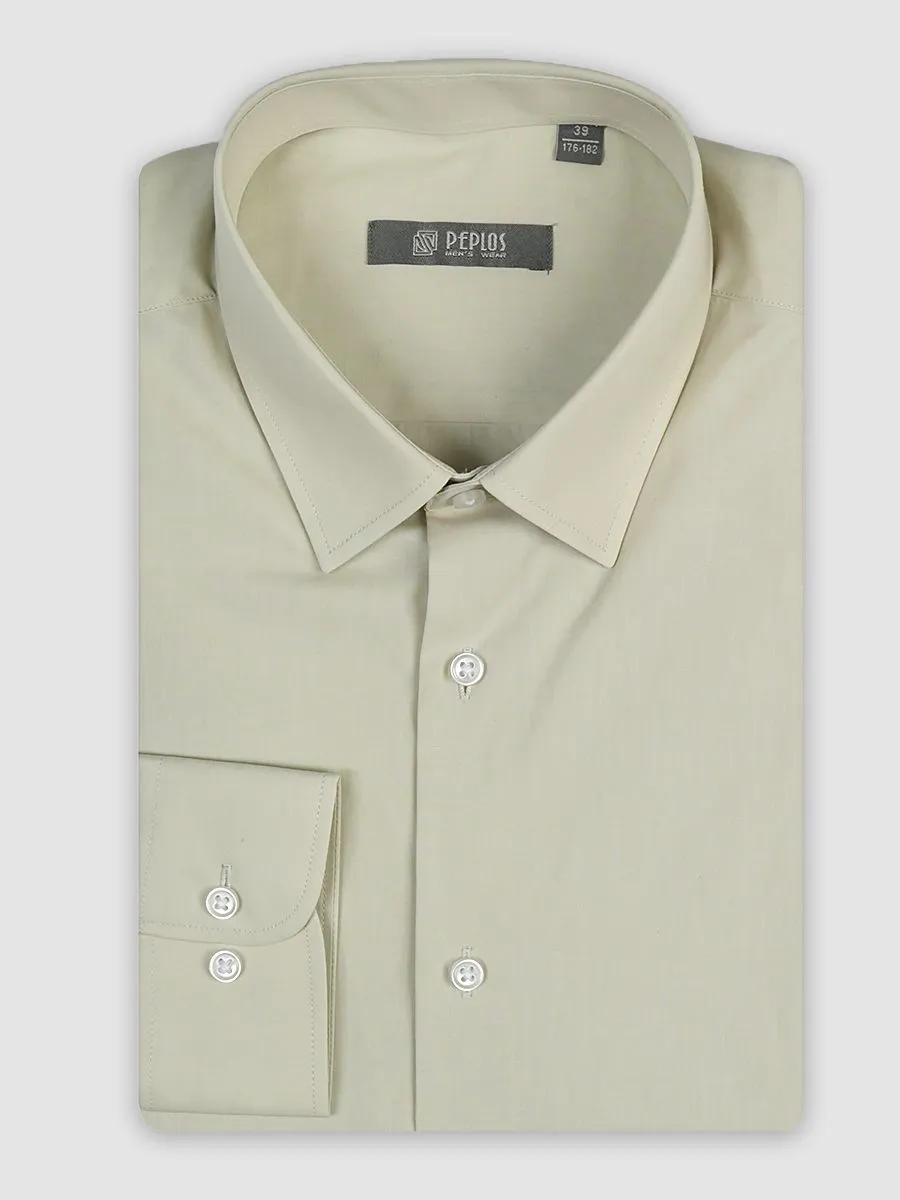 Мужская однотонная сорочка PEPLOS оливкового цвета. Силуэт сорочки приталенный. Рукав длинный. Состав: хлопок: 60%, ПЭ: 40%.