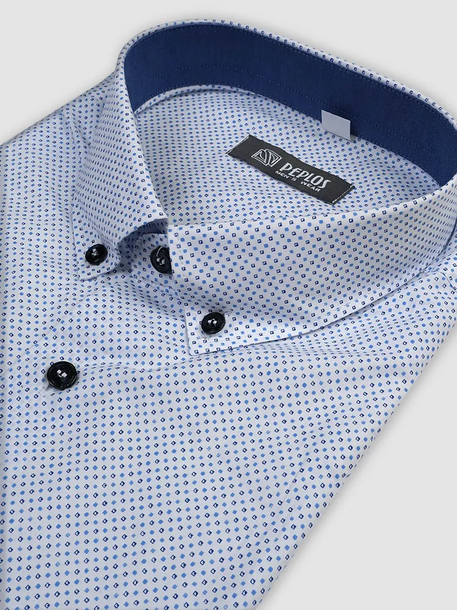 Мужская сорочка PEPLOS голубого цвета с точечным двухцветным узором. Силуэт сорочки приталенный. Рукав длинный. Черные глянцевые пуговицы - изюминка сорочки. Состав: 100% хлопок.