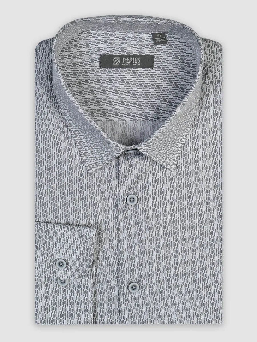 Мужская сорочка PEPLOS серого цвета с объемным рисунком. Силуэт сорочки приталенный. Рукав длинный. Состав: 100% хлопок. Комфортный деловой look для рабочих будней в комплекте с сорочкой и брюками TR22056-222-4 в стиле casual.