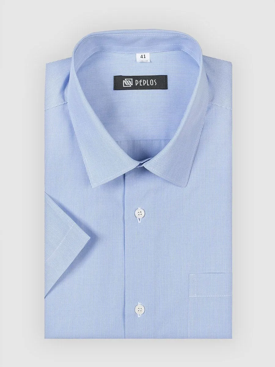 Сорочка с коротким рукавом изготовлена в полуприлегающем силуэте. Выполнена из ткани с рисунком в виде очень мелкой клетки, которая издалека практически сливается в единое целое. Такая сорочка - подходящий вариант для офисных летних будней.