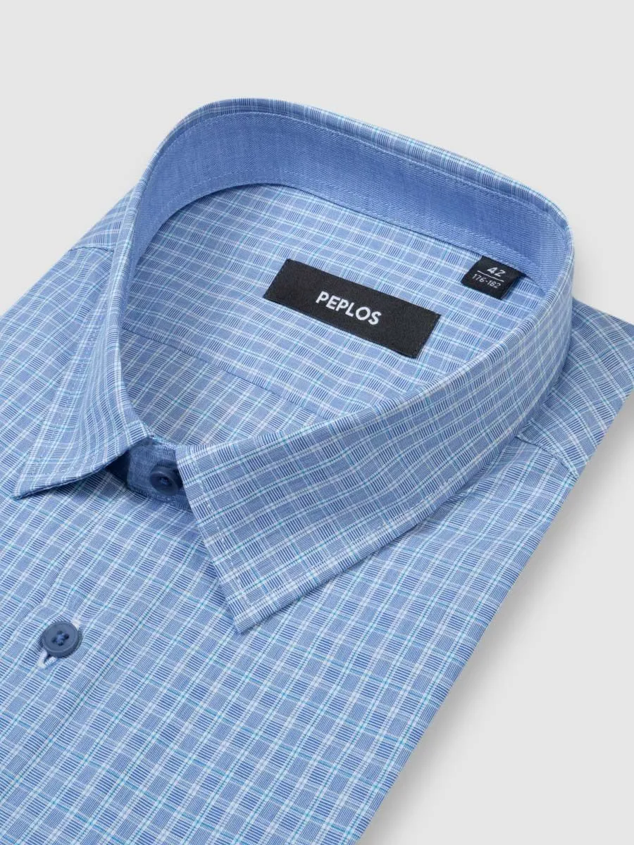 Классическая мужская сорочка с короткими рукавами. Синяя сорочка имеет рисунок в виде клетки, есть нагрудный карман. Длина сорочки укороченная.