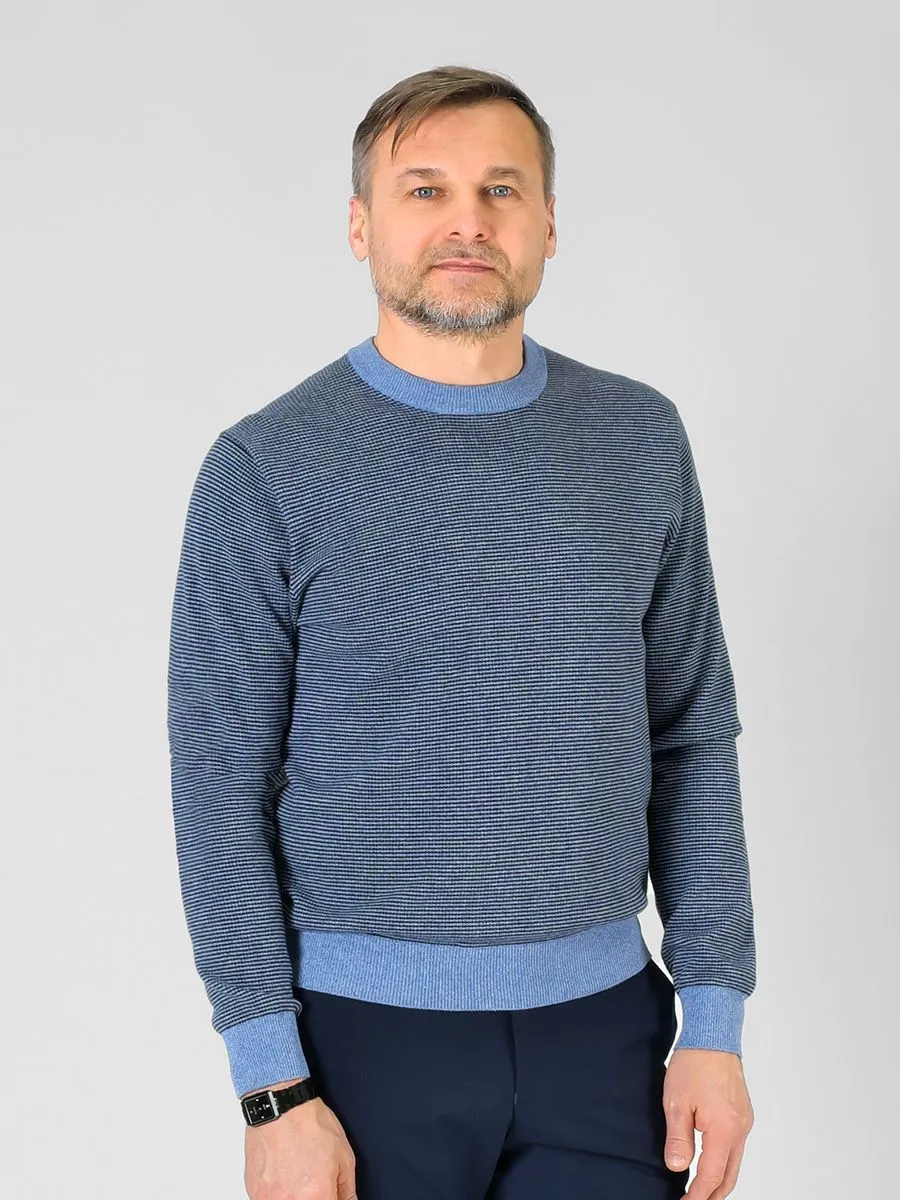 Хлопковый джемпер красивого голубого оттенка -это универсальный элемент гардероба, легко сочетающийся с брюками различного цвета. У джемпера мелкая жаккардовая вязка, круглый ворот и контрастная мягкая резинка по низу изделия и рукавов, а также у ворота. Отличным вариантом образа будет сочетание с брюками насыщенного синего цвета TR-23102.