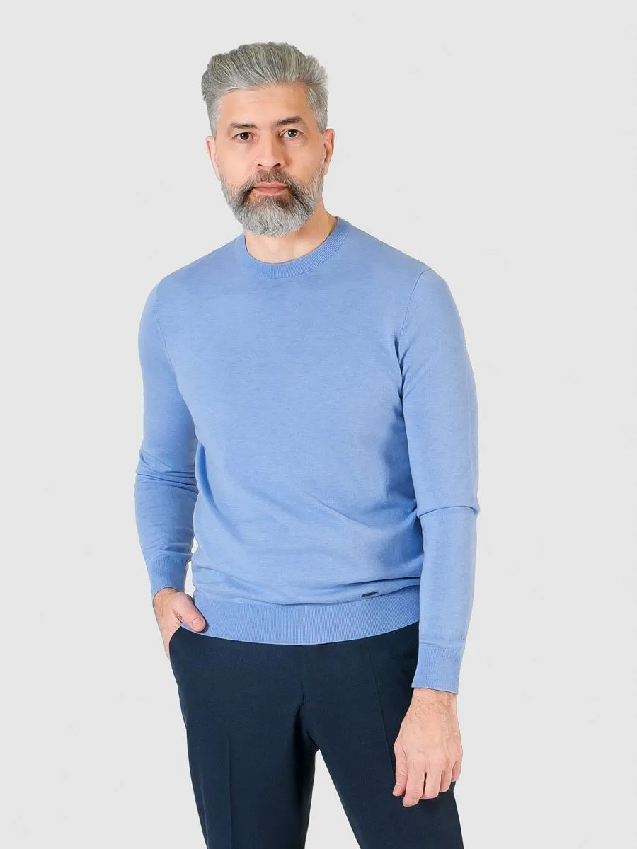 Джемпер светло-голубого оттенка с длинным рукавом из вязаного трикотажа. Светлый оттенок этого джемпера призван придать свежести и непринужденности образу. Трикотажный материал, из которого изготовлен этот джемпер, обладает прекрасными теплоизолирующими свойствами. Он мягкий на ощупь и приятный для кожи, предоставляя ощущение комфорта и уюта. Круглый ворот придает образу некую изысканность и делает его более интересным. Кроме того, такой воротник отлично подходит как для придания формальности, так и для создания повседневного, непринужденного стиля.