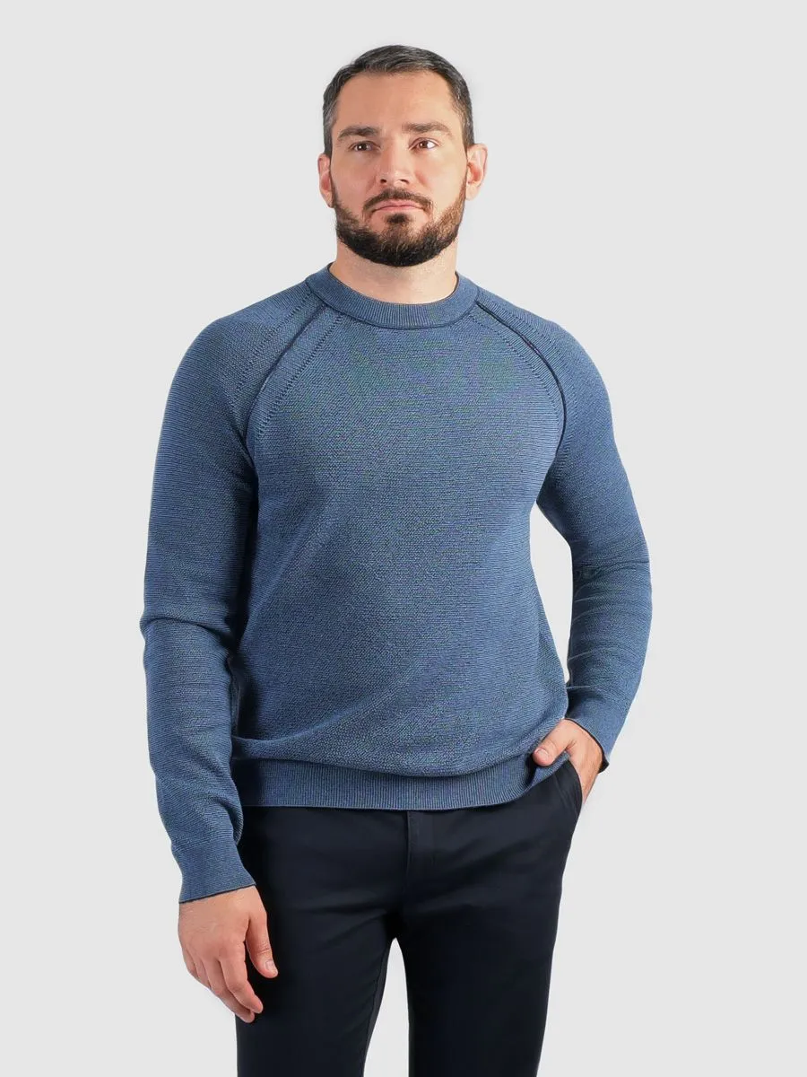 Данный джемпер выполнен из пряжи двух оттенков: синего и тёмно-синего. Мелкий жаккард по всему изделию. Рукав-реглан, швы наружу. Подходит для джинc и брюк casual, идеально для создания повседневных образов. Этот джемпер станет отличным дополнением вашего гардероба, добавляя нотку изысканной небрежности и комфорта в повседневный стиль. Прекрасно сочетается как с кедами, так и с ботинками, даря вам свободу выбора в создании модного и практичного лука.