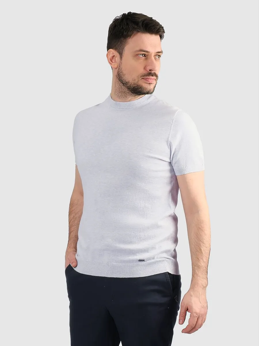 Мужская трикотажная футболка с короткими рукавами, вырез круглый, выполнена в нежном небесно-голубом цвете с меланжевым эффектом.