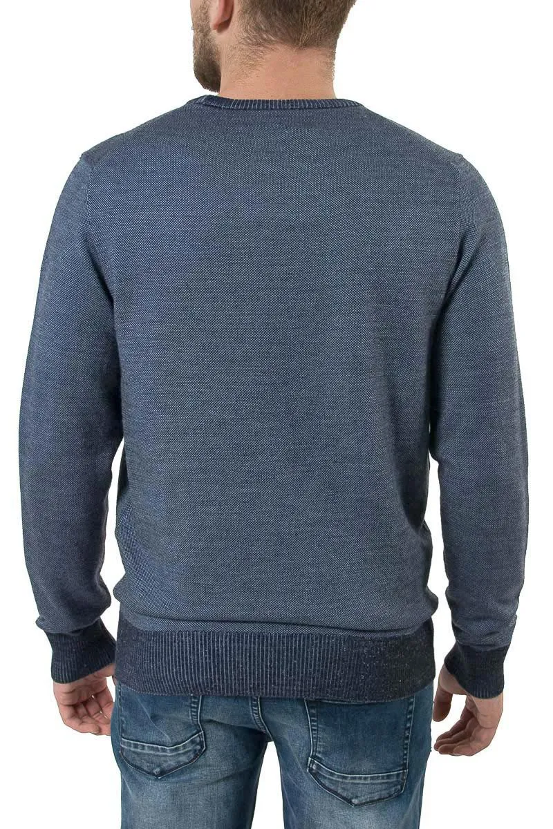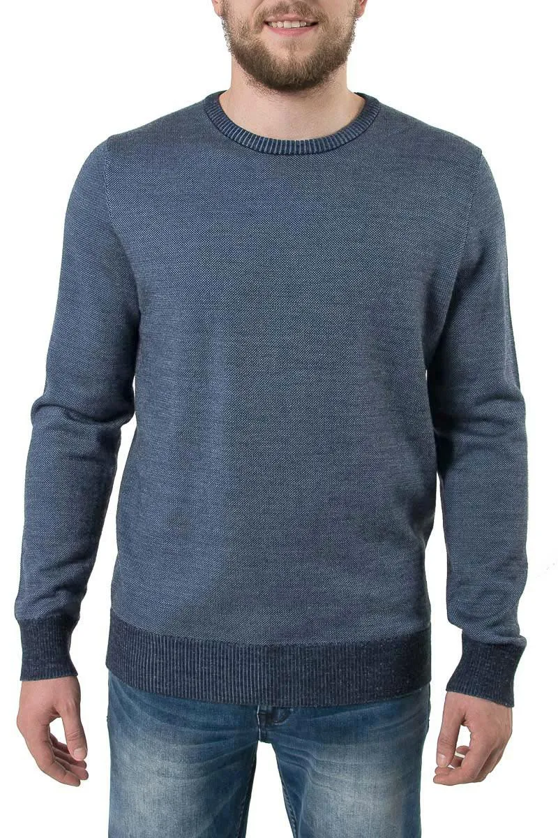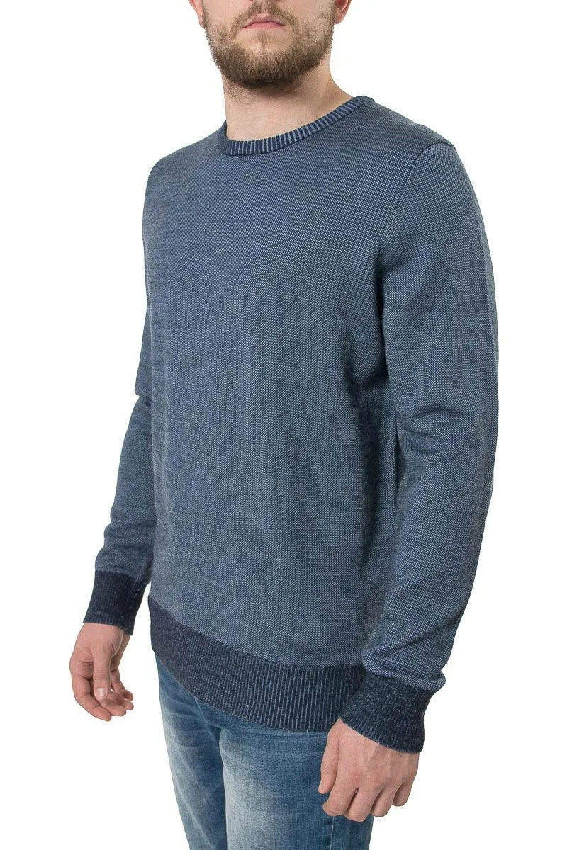 Голубой полушерстяной джемпер с крыглым вырезом горловины. Идеален для холодного времени года. Манжеты, низ и ворот дополнены специальными тканевыми резинками.