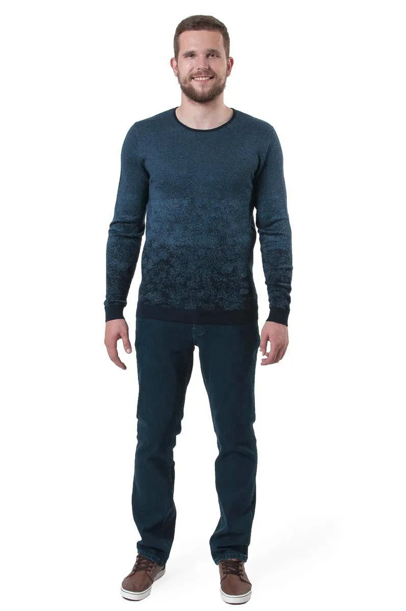 Синий полушерстяной джемпер с круглым воротом. Идеально подходит для холодного вреемни года. Имеет градиентный рисунок на ткани. Низ, манжеты и горловина дополнены специальными резинками.