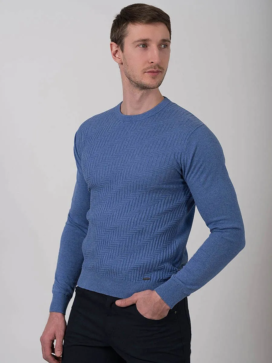 Классический голубой цвет джемпера позволяет его сочетать с различными цветами брюк- от универсального черного до песочного. Джемпер выполнен из тонкого высококачественно хлопка с фактурным рисунком, расположенным по диагонали. На манжетах рукавов и по низу изделия проходит эластичная резинка в тон. Дышащий хлопковый состав и толщина джемпера дают возможность надеть сверху пиджак для утепления в холодное время года.