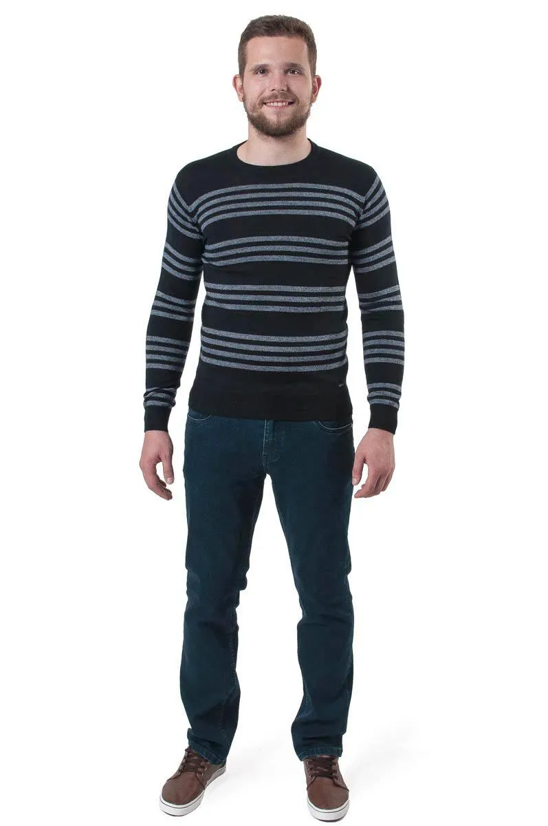Темно-синий полушерстяной джемпер, с круглым вырезом горловины, в серую полоску. Низ и манжеты дополнены резинкой во избежания преждевременного вытягивания ткани.