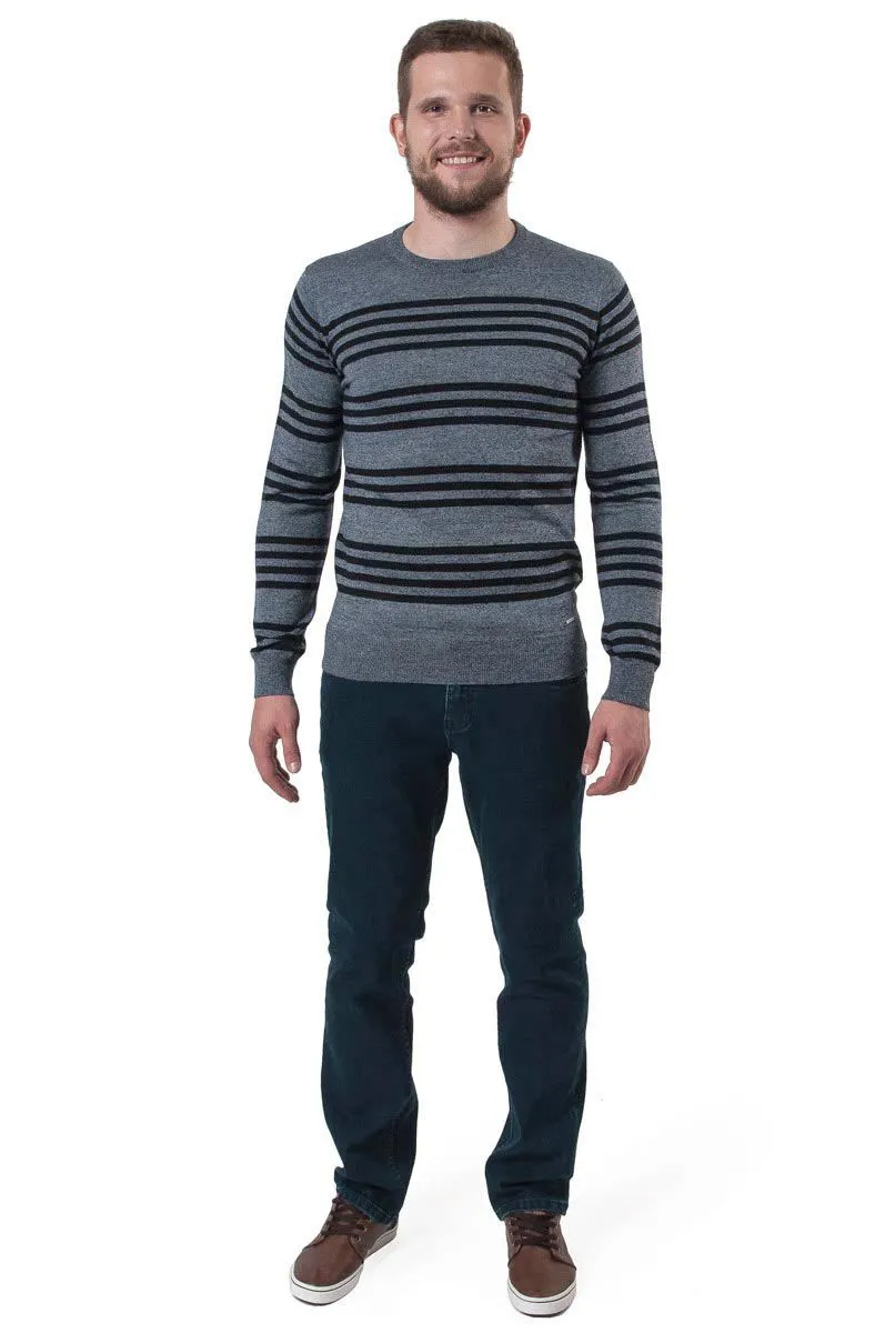 Синий полушерстяной джемпер с полосами. Низ и манжеты оформлены в форме резинок.