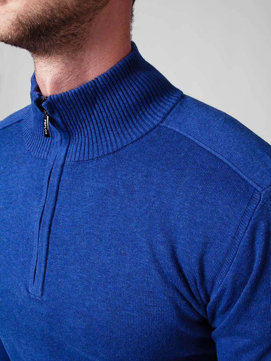 Красивый ярко-синий мужской джемпер Peplos c воротником стойкой дополнит любой повседневный образ. Благодаря присутствующей молнии на 1/4 джемпер становится более практичным и универсальным. Поэтому изделие сочетает в себе стиль и комфорт. На локтевых частях присутствует жаккардовая вязка, которая напоминает заплатки. Такая же вязка есть и на боковых частях изделия. На плечах детали в виде кокетки.