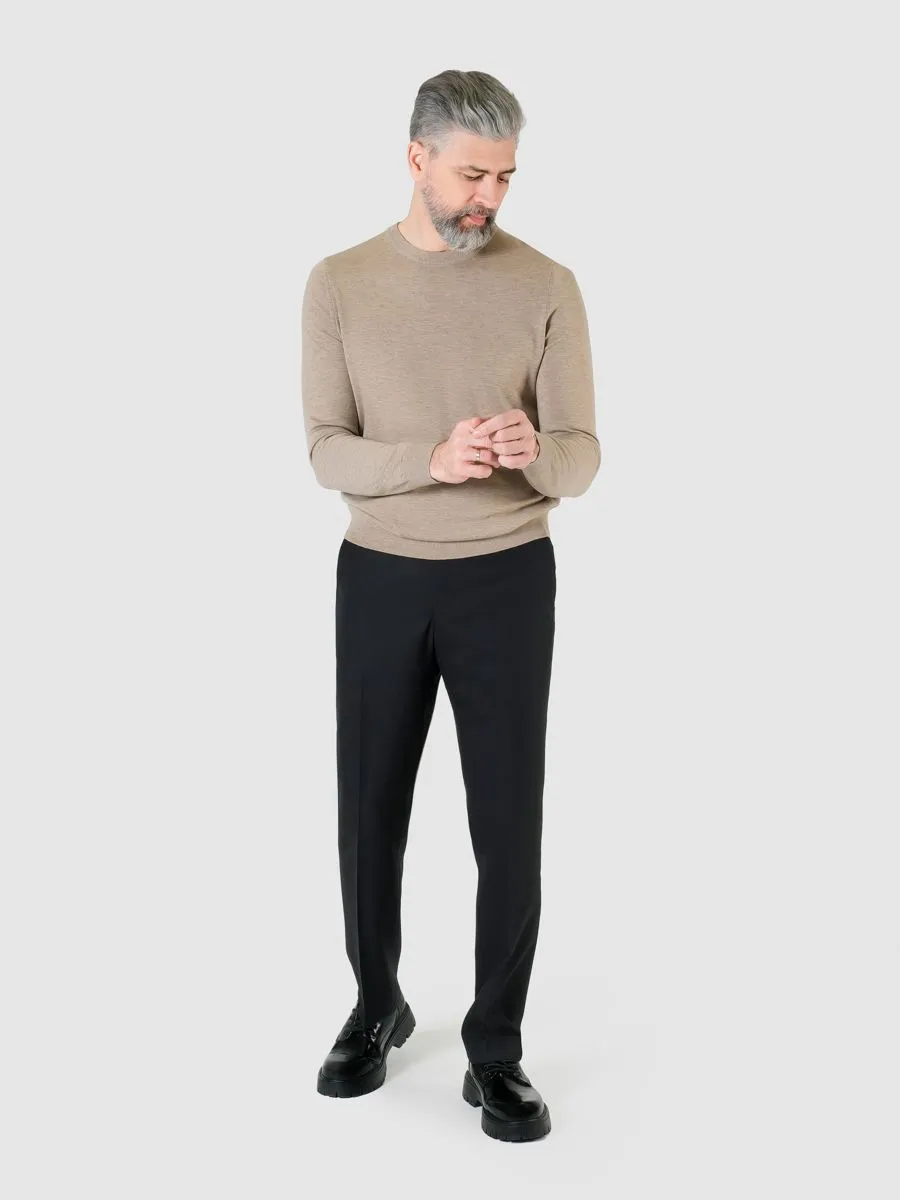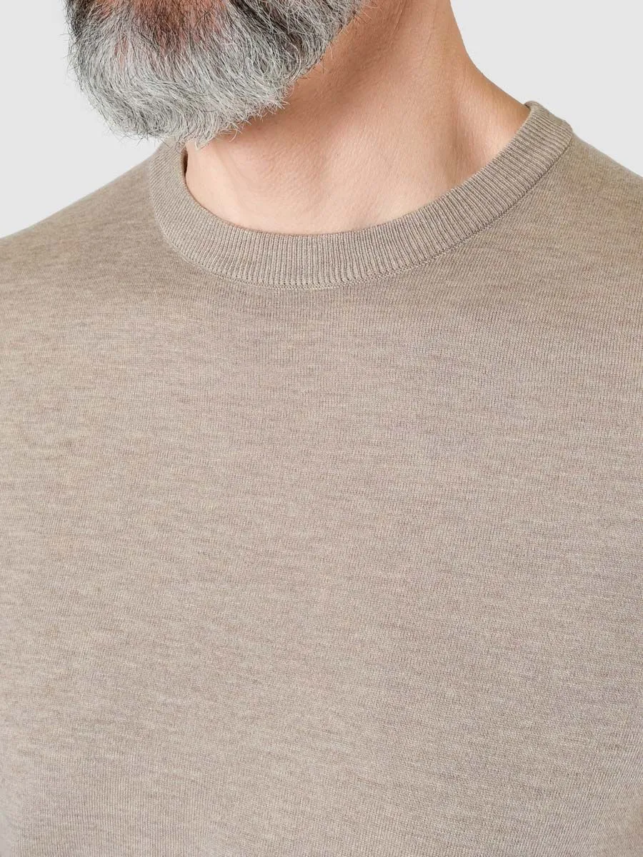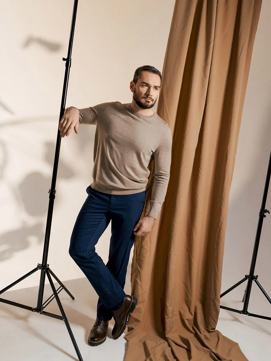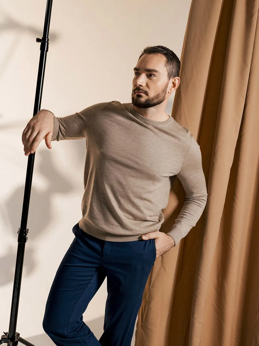 Мужской джемпер бежевого цвета с круглым воротом и добавлением 6% шерсти - отличный выбор для тех, кто ценит комфорт и стиль. Такой джемпер идеально подойдет для прохладной погоды, а приятный бежевый цвет создаст спокойный, нейтральный образ. Джемпер из тонкой деликатной вязки будет отличным выбором для повседневной носки.