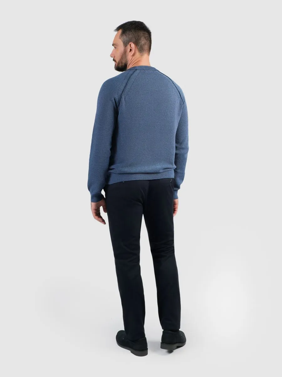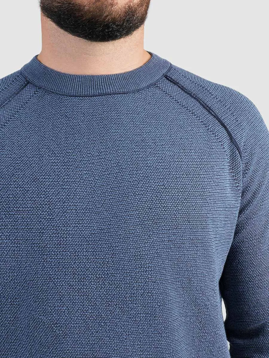 Данный джемпер выполнен из пряжи двух оттенков: синего и тёмно-синего. Мелкий жаккард по всему изделию. Рукав-реглан, швы наружу. Подходит для джинc и брюк casual, идеально для создания повседневных образов. Этот джемпер станет отличным дополнением вашего гардероба, добавляя нотку изысканной небрежности и комфорта в повседневный стиль. Прекрасно сочетается как с кедами, так и с ботинками, даря вам свободу выбора в создании модного и практичного лука.